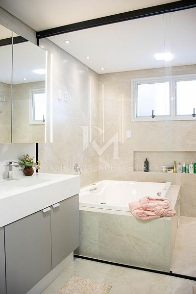 Com 279m² de área construída, o imóvel foi cuidadosamente planejado para proporcionar fluidez entre os ambientes, aliando elegância à funcionalidade. São três suítes amplas, incluindo uma suíte master com hidromassagem e sacada privativa. Todos os dormitórios contam com persianas elétricas e excelente iluminação natural, enquanto os banheiros exibem acabamentos de alto padrão e box até o teto.