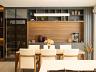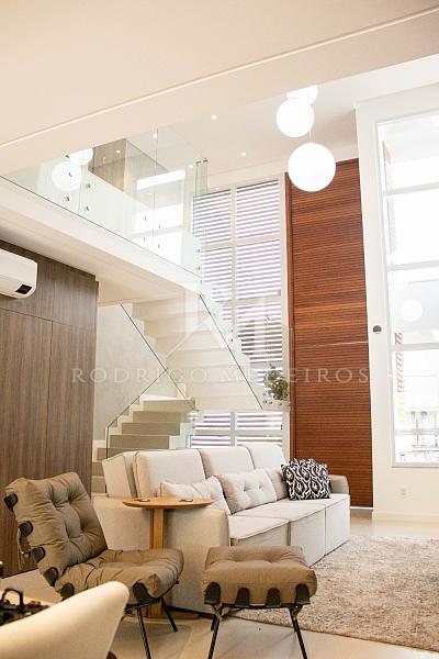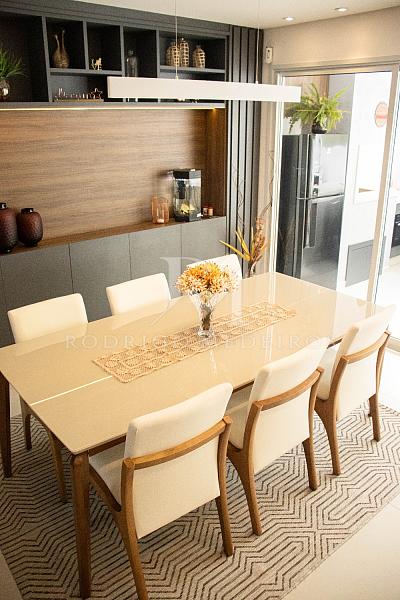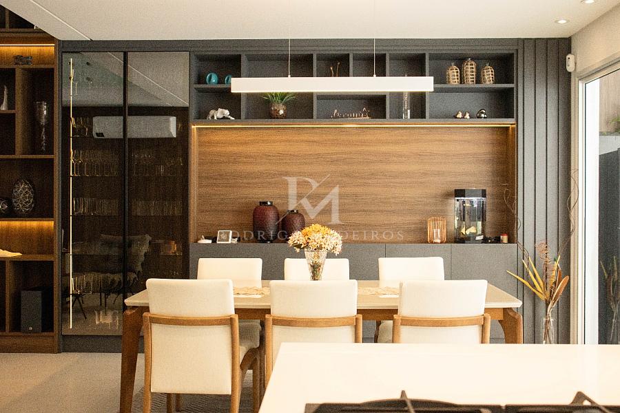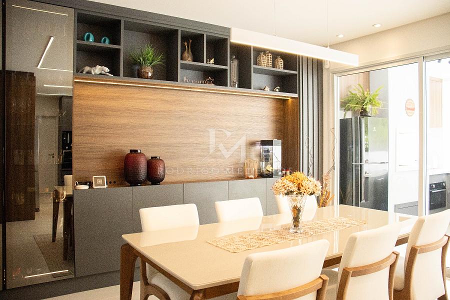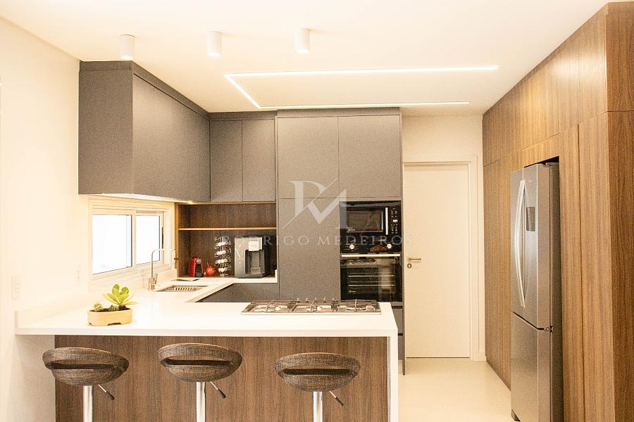 O projeto valoriza a integração dos espaços: a cozinha, totalmente equipada e com móveis sob medida, se conecta à área gourmet com churrasqueira a carvão e ao living com pé direito duplo e lareira a gás, criando um ambiente acolhedor e sofisticado para receber.