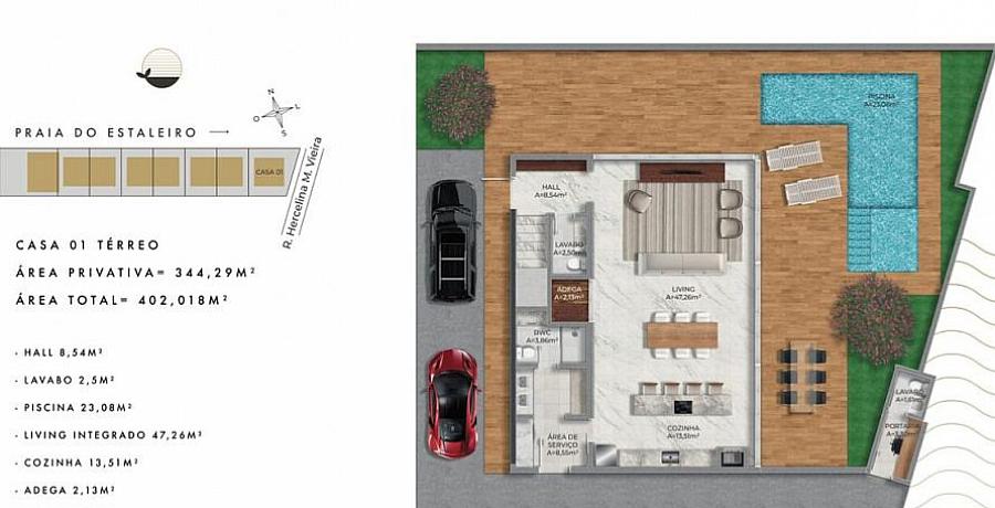 Com 344m² de área privativa, o imóvel proporciona um amplo espaço para viver com conforto e comodidade. Em fase de construção, essa é uma oportunidade única de investimento, sendo a única casa do condomínio com vista frontal para o mar.
