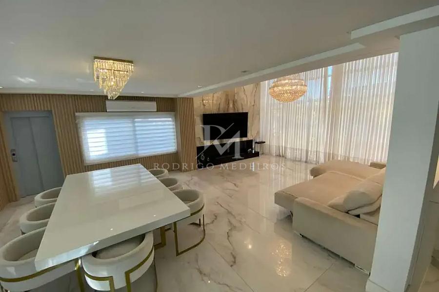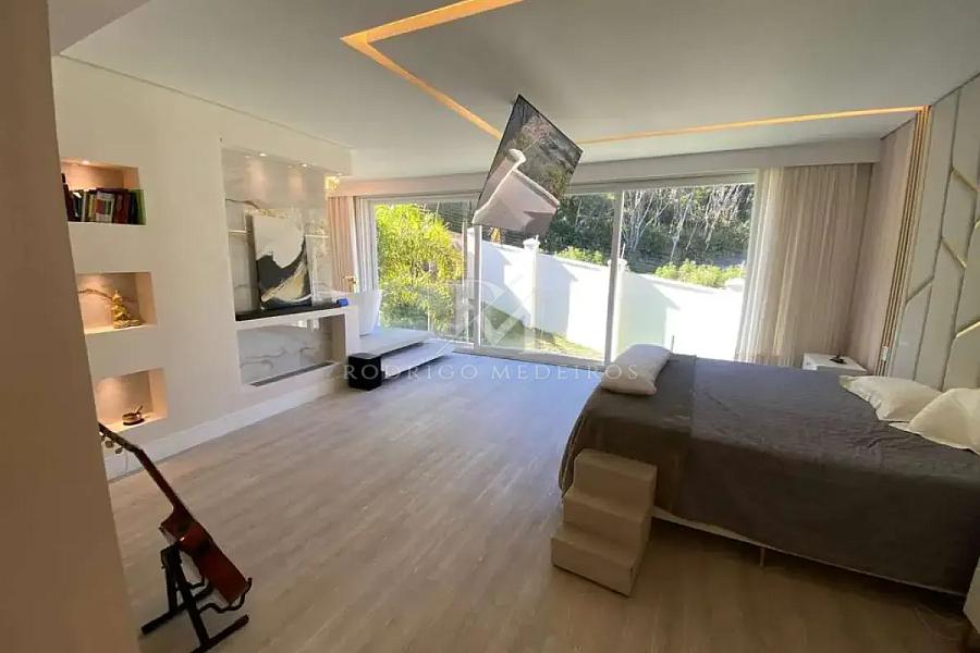 A área íntima oferece cinco suítes, incluindo uma suíte master com closet e banheira de hidromassagem para quatro pessoas, além de um dormitório adicional que pode ser adaptado conforme a necessidade. Os ambientes são amplos, bem ventilados e pensados para proporcionar conforto absoluto.