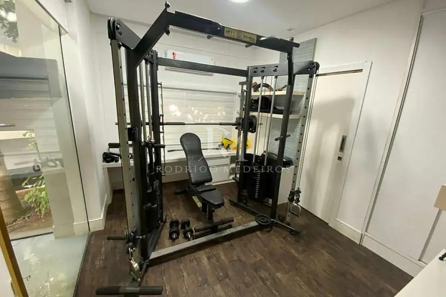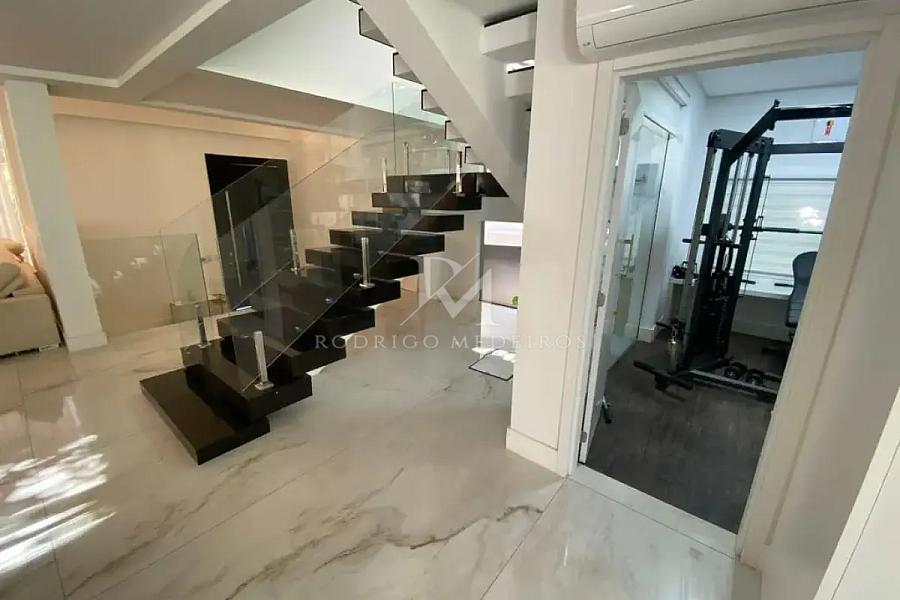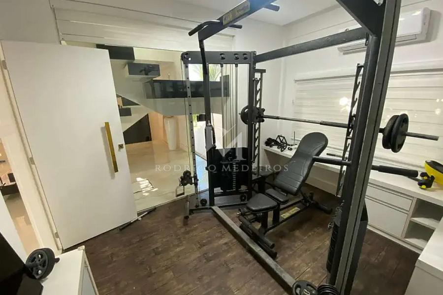 A residência se diferencia pela estrutura de lazer privativa, que eleva o padrão de uso da casa. São duas piscinas — uma térrea, aquecida e parcialmente coberta, e outra no terceiro pavimento com água salgada e vista privilegiada — criando diferentes cenários para relaxamento e convivência. O espaço gourmet é completo, com duas churrasqueiras a carvão e salão de festas com isolamento acústico, além de mesa de sinuca e academia equipada.