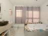 A área externa convida ao lazer e ao relaxamento. A varanda com deck se conecta à piscina e à sauna, criando um ambiente ideal para aproveitar diferentes momentos do dia. O jardim complementa o cenário com um toque natural, enquanto a lavanderia com móveis planejados reforça a funcionalidade da casa.