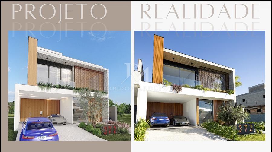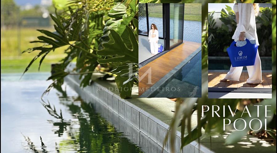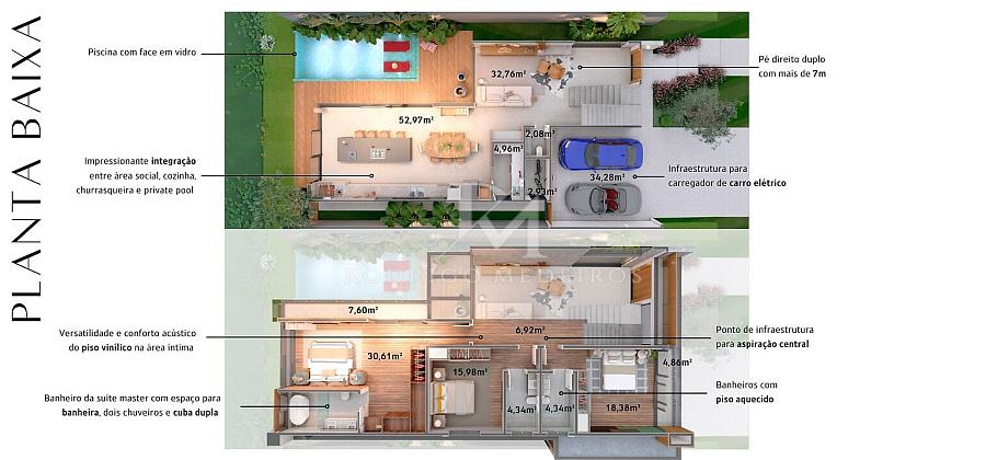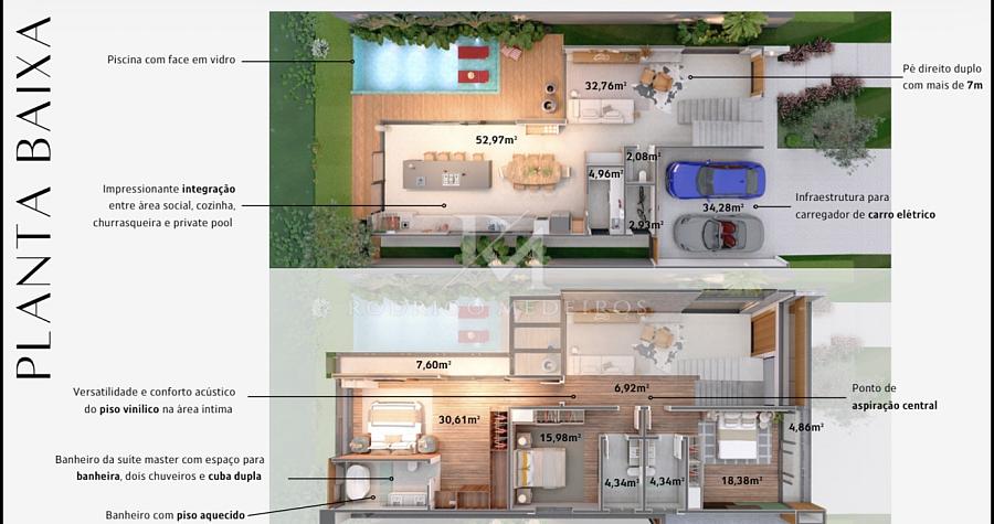 Com 284m² de área privativa distribuídos em dois pavimentos, a casa oferece ambientes generosos e repletos de luz natural. No piso térreo, o living com pé-direito duplo superior a sete metros cria um ambiente imponente e acolhedor. A cozinha gourmet integrada à área externa convida para momentos especiais, com churrasqueira e piscina climatizada com borda de vidro que se funde ao paisagismo cuidadosamente desenhado.