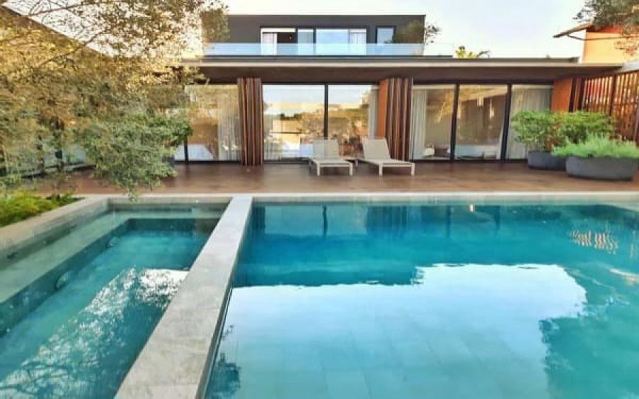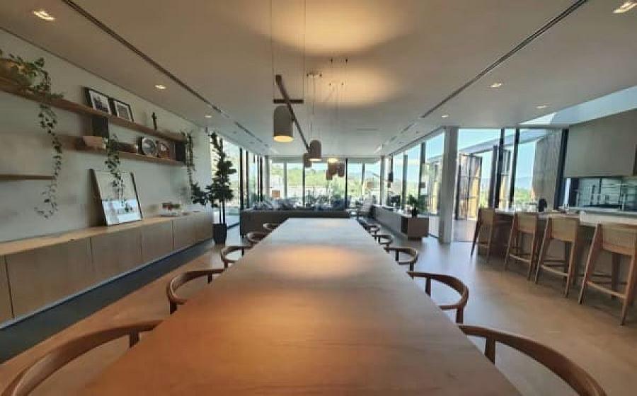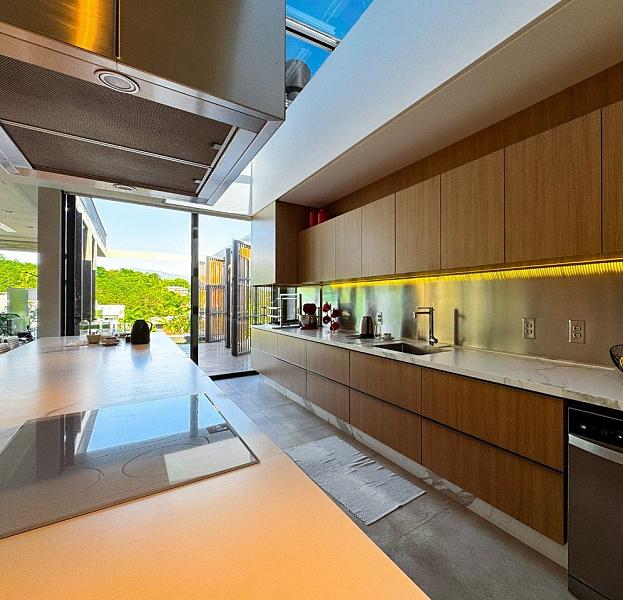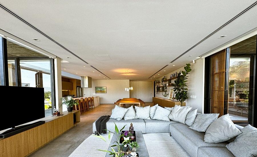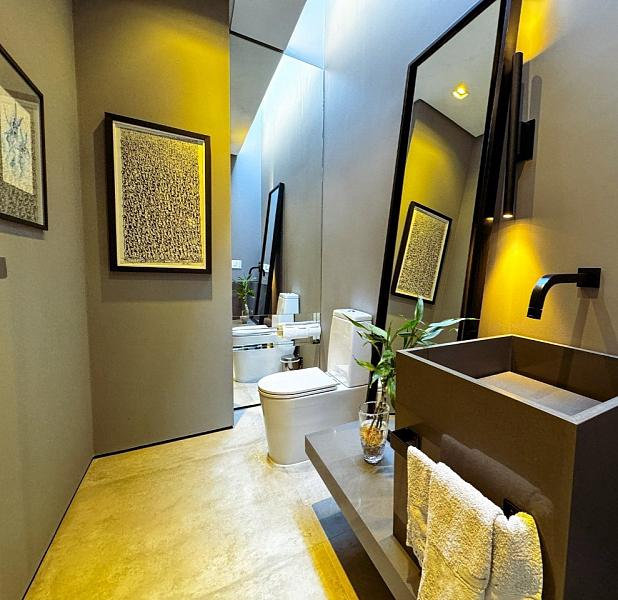 Com 683 m² de área construída, a casa dispõe de três suítes térreas com amplas janelas voltadas para o mar e a piscina. No piso superior, uma sala multiuso permite diversas configurações — de home office a suíte reversível — enquanto o subsolo reserva espaço para um estúdio, academia ou outra suíte.