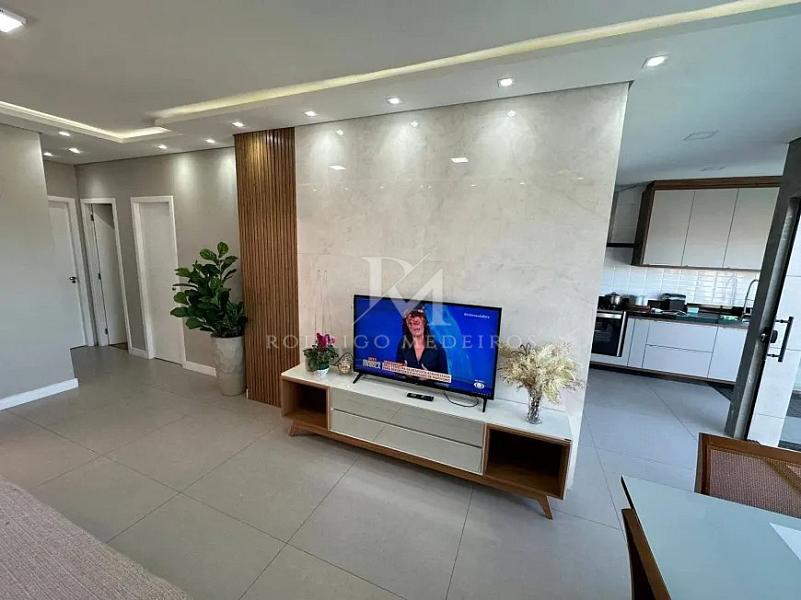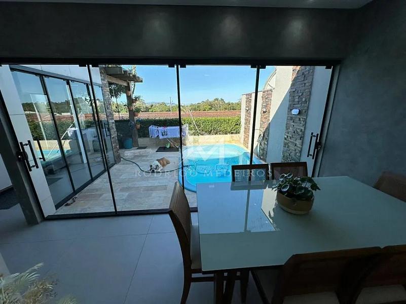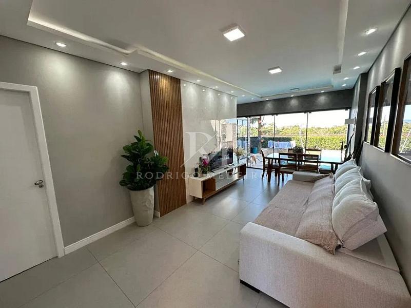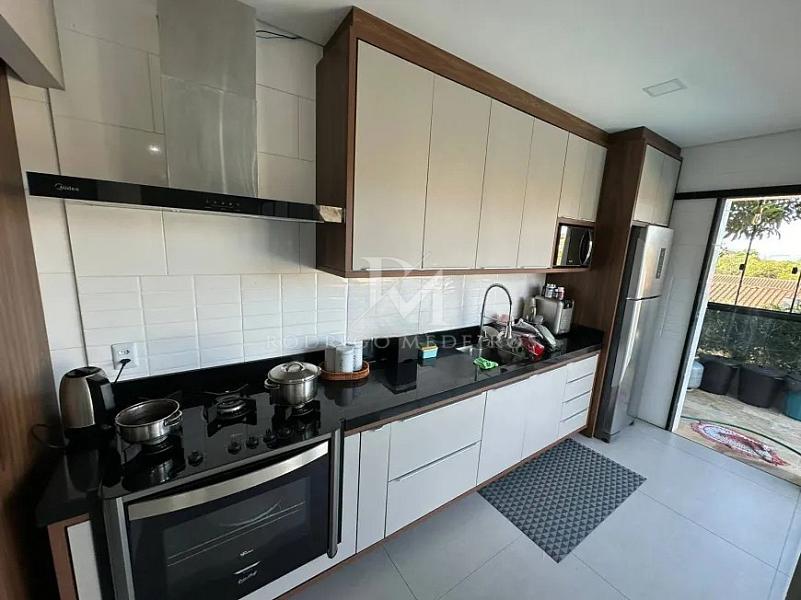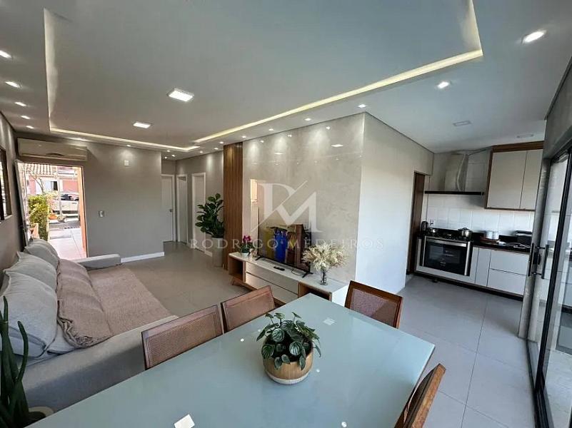 A área social integra sala de estar e jantar de forma fluida, conectando-se à cozinha planejada e aos ambientes externos. O imóvel conta com três dormitórios, sendo uma suíte, atendendo com conforto tanto famílias quanto quem busca um espaço versátil para home office ou visitas.