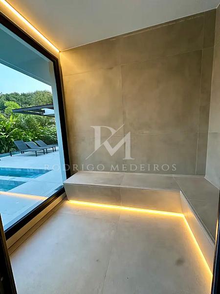 Para momentos de lazer e bem-estar, a casa oferece uma área externa completa, com piscina com ofurô aquecido, sauna e espaços pensados tanto para relaxar quanto para receber. A academia privativa complementa a experiência, permitindo uma rotina ativa dentro da própria residência.