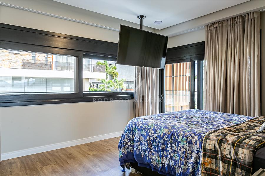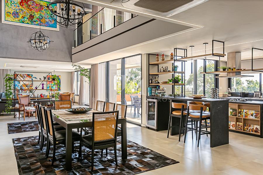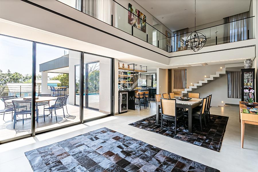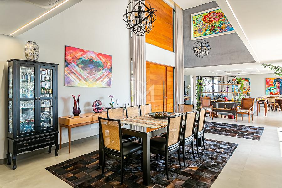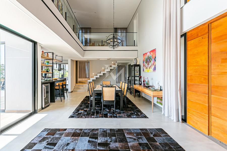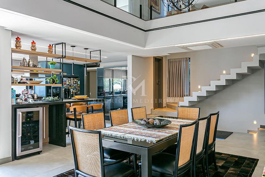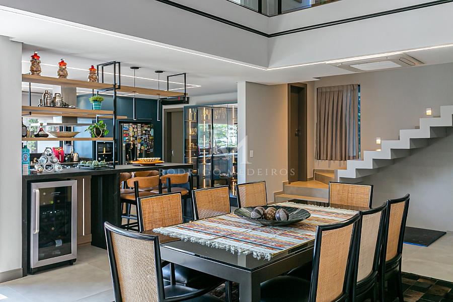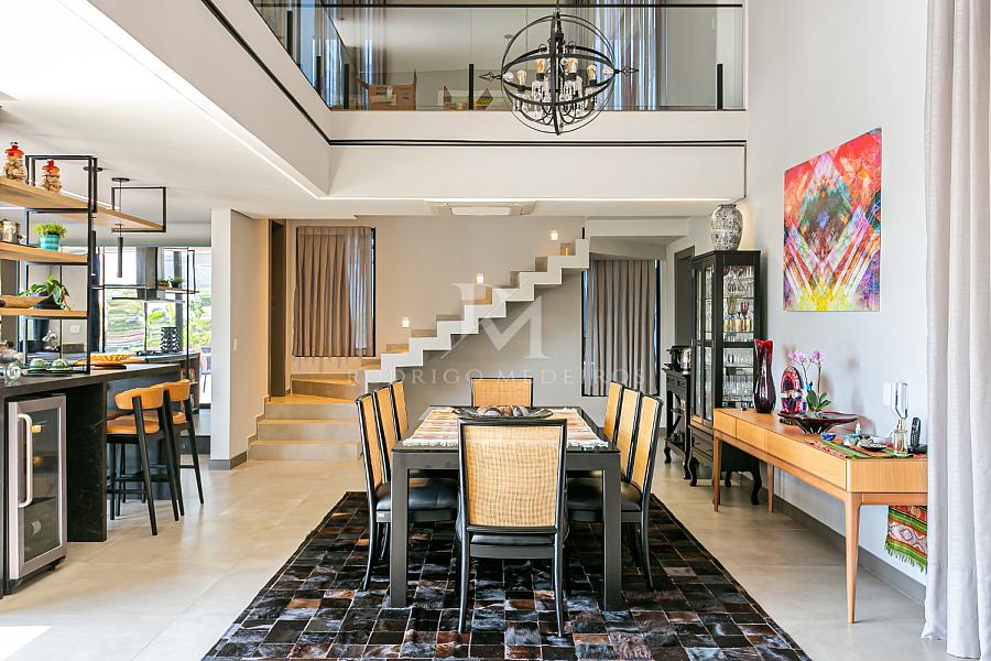 A residência possui cinco quartos no total, sendo três suítes amplas que garantem privacidade e comodidade, além de duas demi-suítes ideais para o conforto da família e convidados. A área íntima é complementada por ambientes bem planejados e acabamento de alto padrão.