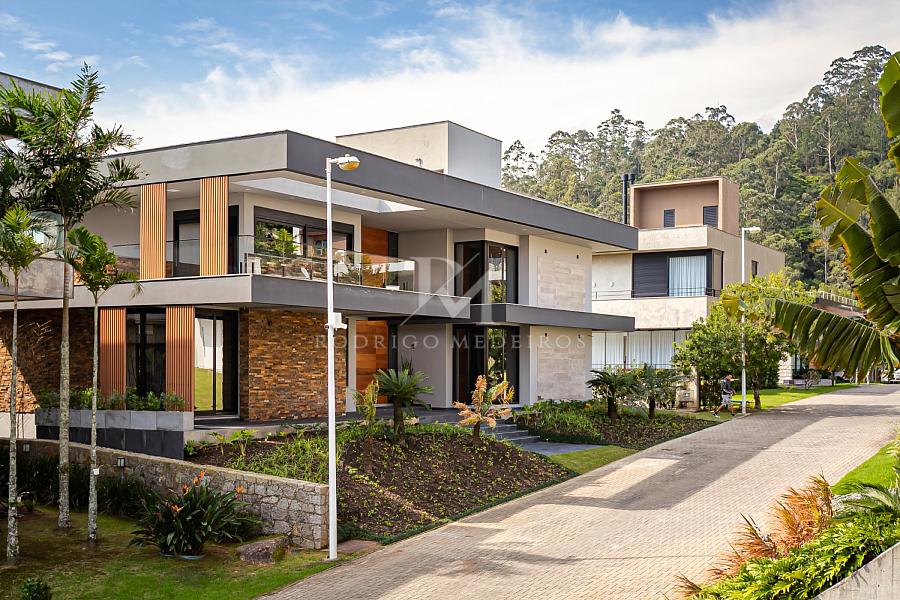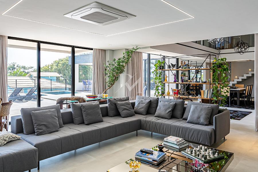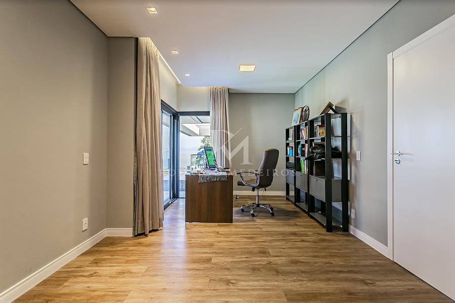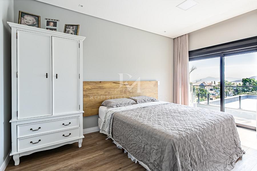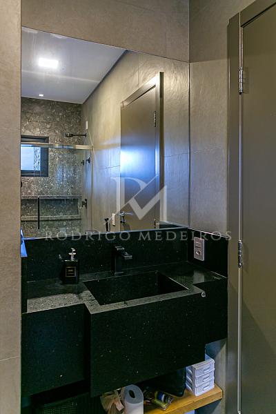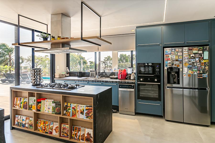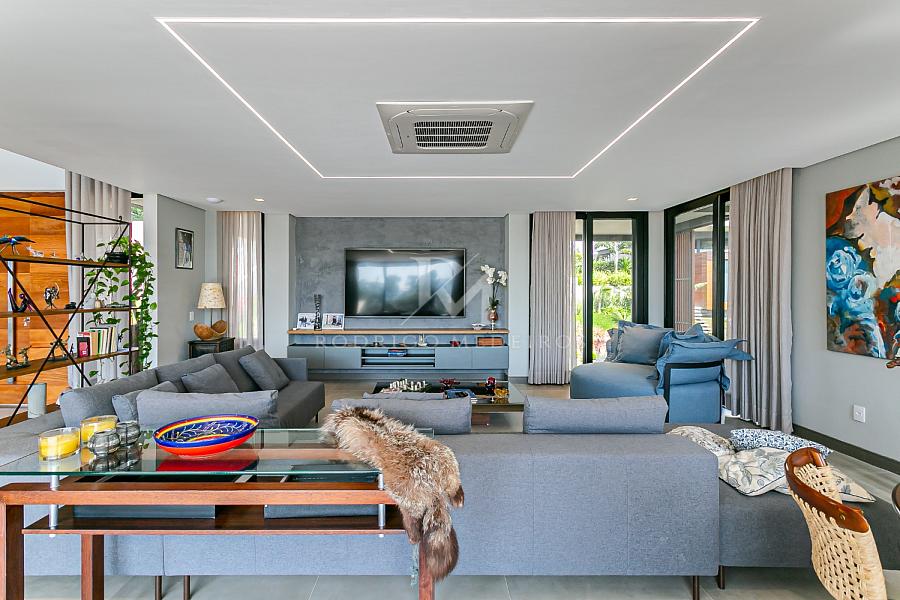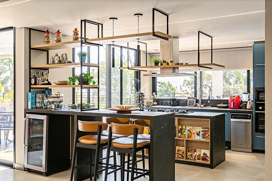 A residência possui cinco quartos no total, sendo três suítes amplas que garantem privacidade e comodidade, além de duas demi-suítes ideais para o conforto da família e convidados. A área íntima é complementada por ambientes bem planejados e acabamento de alto padrão.