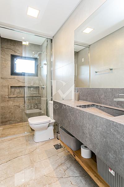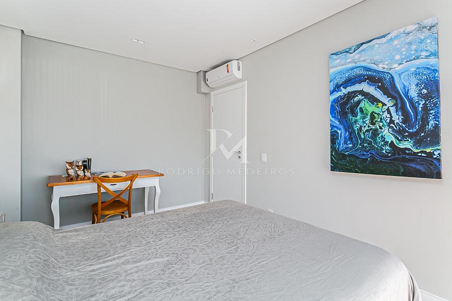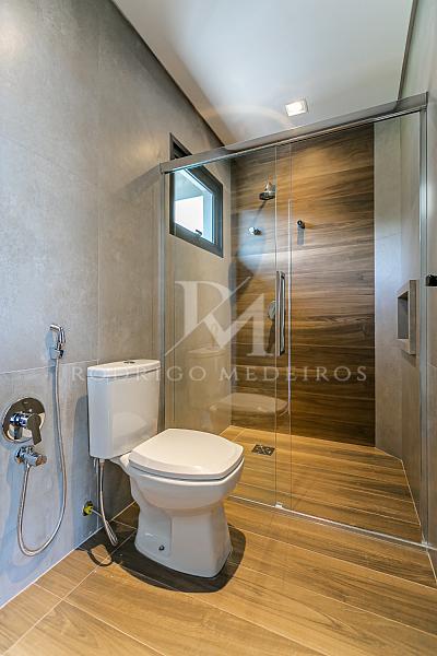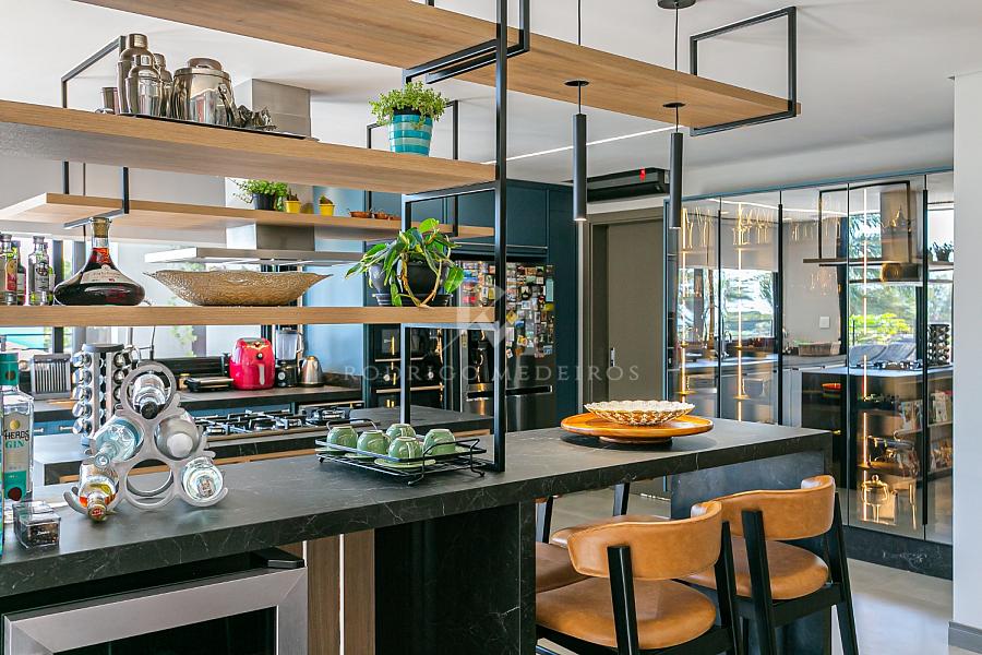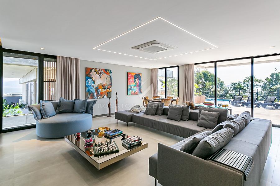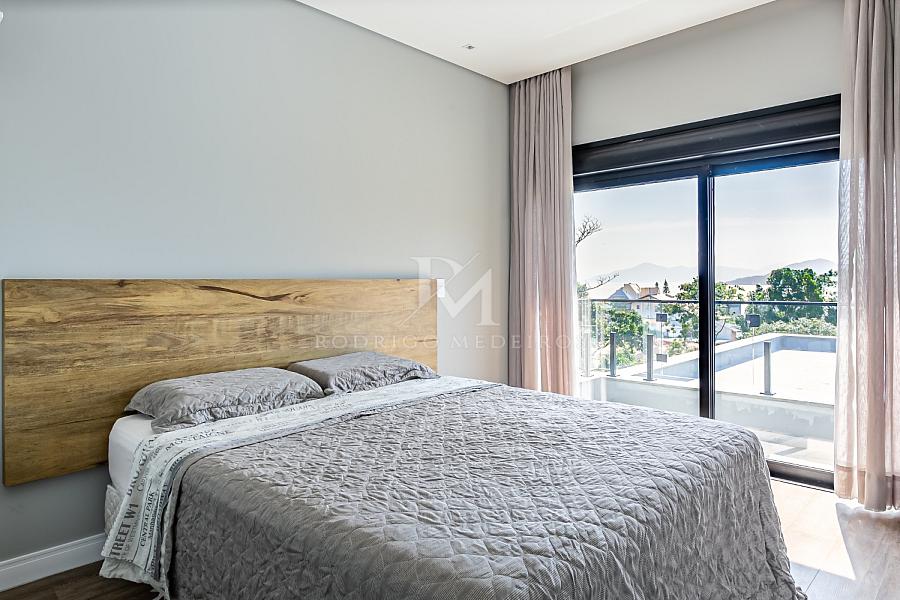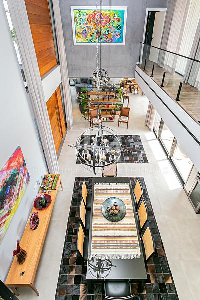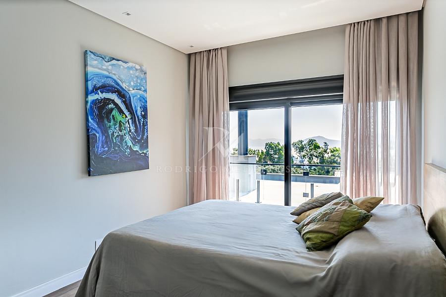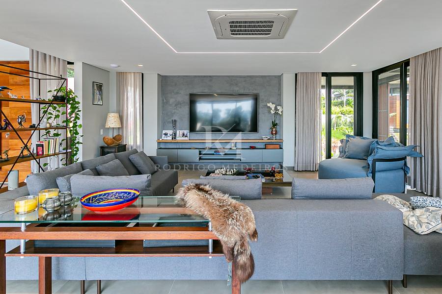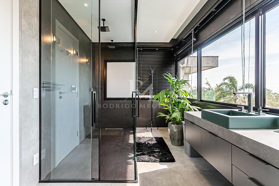 A residência possui cinco quartos no total, sendo três suítes amplas que garantem privacidade e comodidade, além de duas demi-suítes ideais para o conforto da família e convidados. A área íntima é complementada por ambientes bem planejados e acabamento de alto padrão.