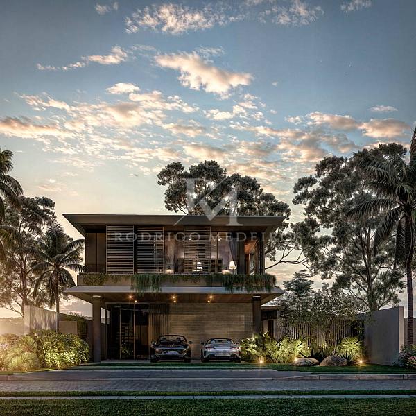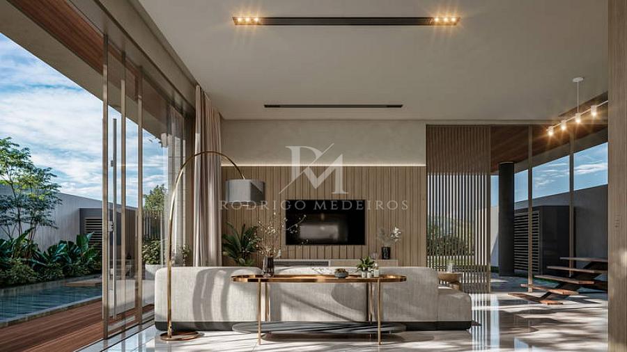 Com projeto assinado pela Taureans e paisagismo que valoriza os elementos naturais, a casa foi desenhada para proporcionar experiências completas — da rotina à contemplação. São cinco suítes bem distribuídas, incluindo duas suítes master, ambas com closet, banheira e acesso direto ao jardim interno, reforçando o caráter privativo e exclusivo da área íntima.