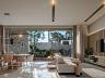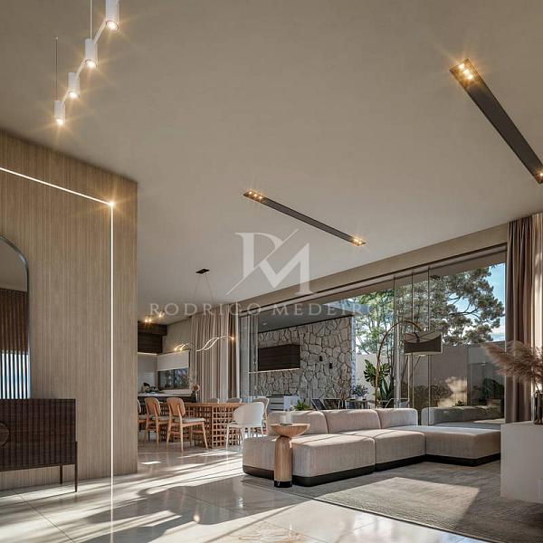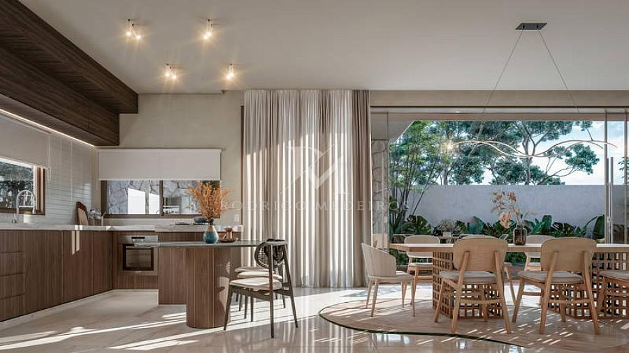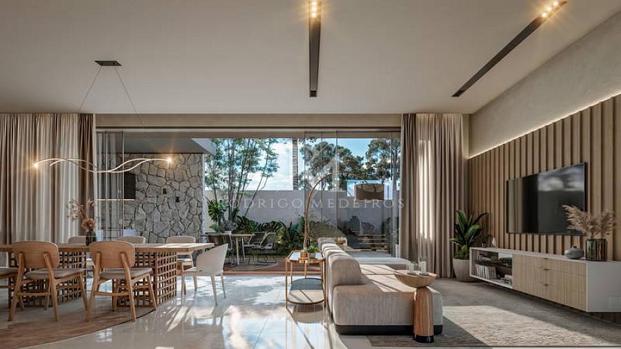 A área social conecta estar, jantar e cozinha em um espaço amplo e fluido, com pé-direito alto, iluminação natural e aberturas que emolduram o verde do jardim e da área externa com piscina. O paisagismo interno e externo reforça a sensação de refúgio e bem-estar em cada ambiente.