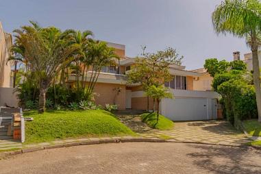 Implantada em um terreno amplo, a residência oferece ambientes generosos e bem distribuídos. No pavimento térreo, estão quatro dormitórios, além de um living com dois ambientes e lareira, criando um espaço acolhedor para convivência familiar e recepção de convidados. O layout privilegia a iluminação natural e a conexão visual com o jardim, reforçando a sensação de amplitude.