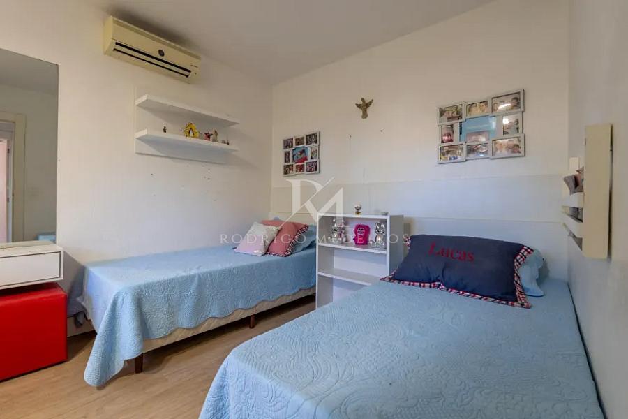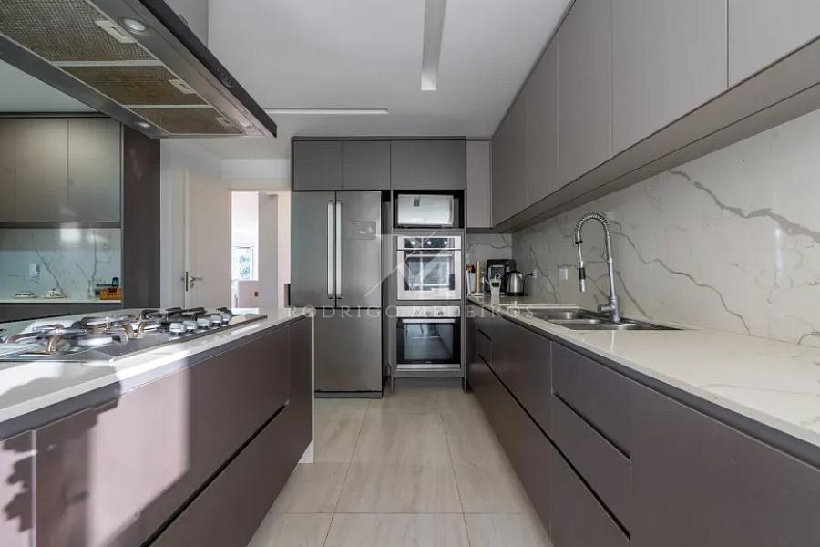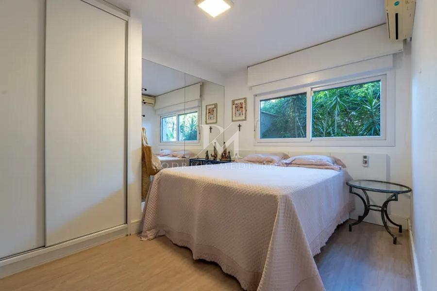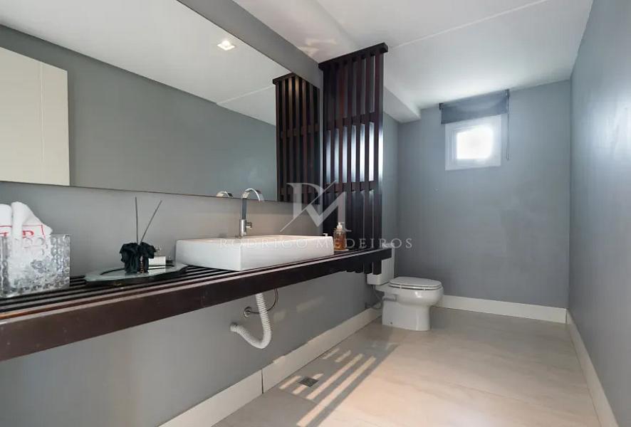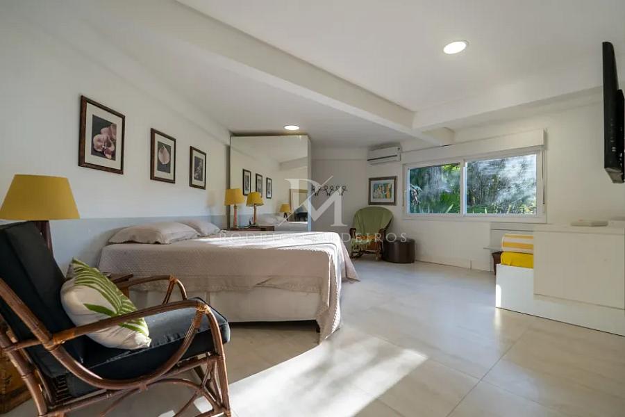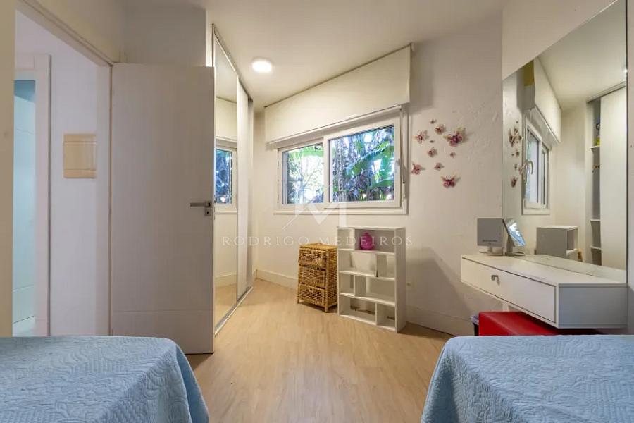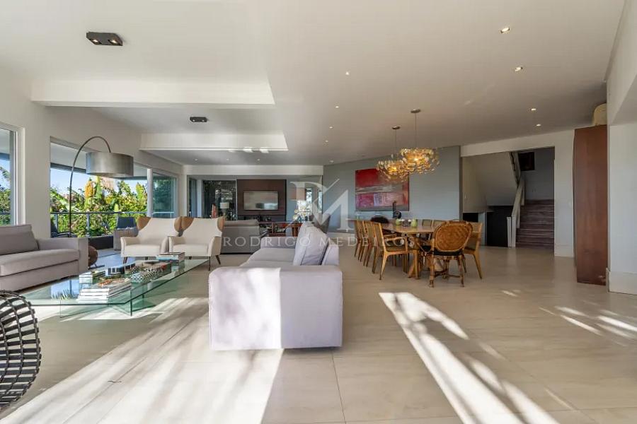 A casa possui 818m² de área construída e uma planta generosa com seis dormitórios, sendo quatro suítes. A suíte máster se destaca pelos 54m² de espaço privativo, banheiro duplo e banheira com vista para o verde. Cada ambiente foi projetado para valorizar a iluminação natural e integrar-se harmoniosamente ao entorno.