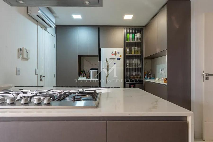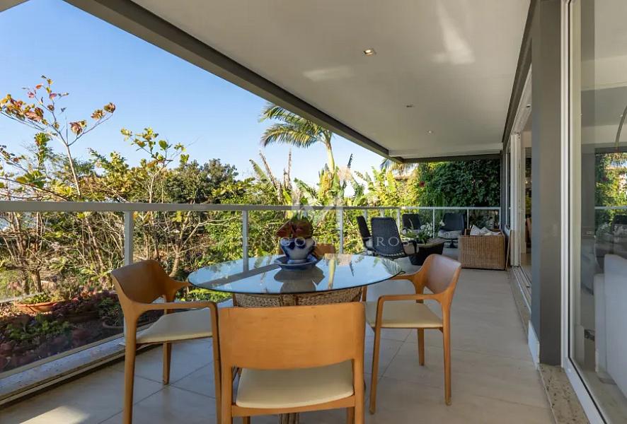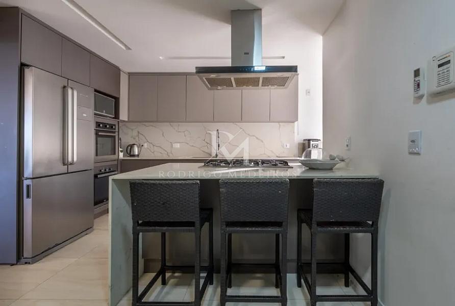 Na área social, a amplitude e o bom gosto se revelam na sala de estar com lareira e na adega sofisticada, que se integram à varanda panorâmica com vista para a Ilha do Francês. A piscina privativa emoldura o cenário com elegância, tornando-se o ponto alto da área de lazer.