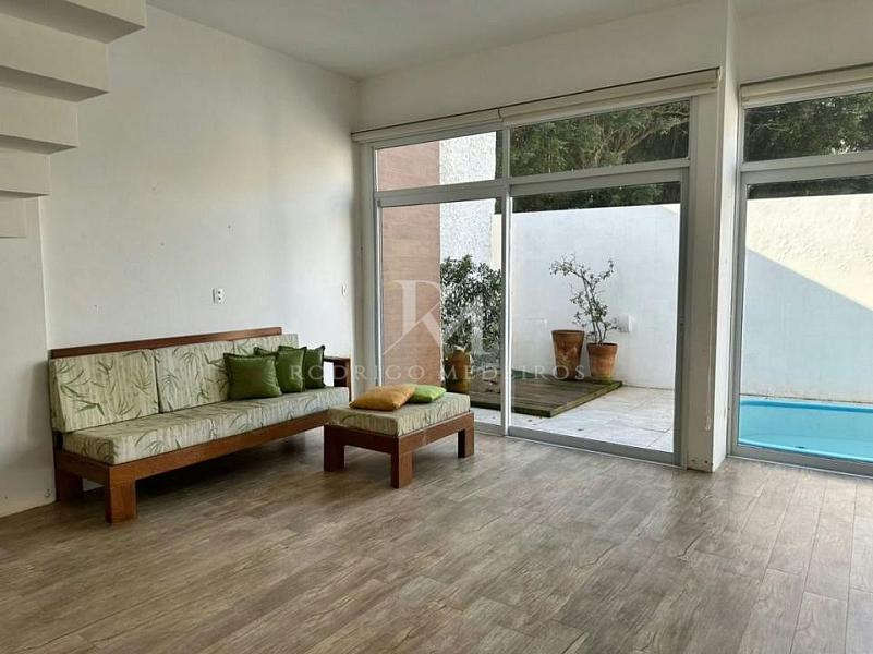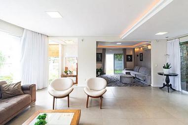 Com arquitetura contemporânea, ambientes amplos e pé direito alto, a casa impressiona desde o primeiro olhar. A enorme janela de vidro na sala de estar emoldura a natureza e inunda os ambientes com luz natural. A cozinha americana, integrada à sala de jantar, cria um ambiente perfeito para reunir família e amigos com conforto e praticidade.