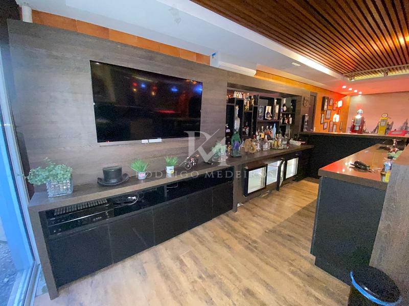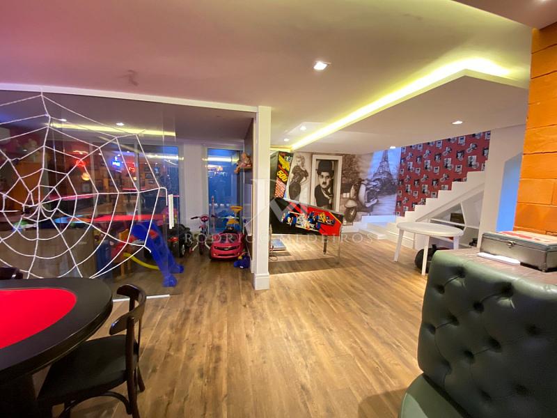 Bar completo, salão de jogos com sinuca e poker, brinquedoteca, suíte de serviço, hobby box e garagem adicional para dois veículos.