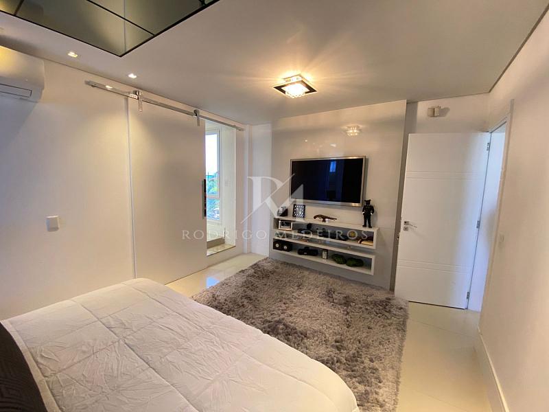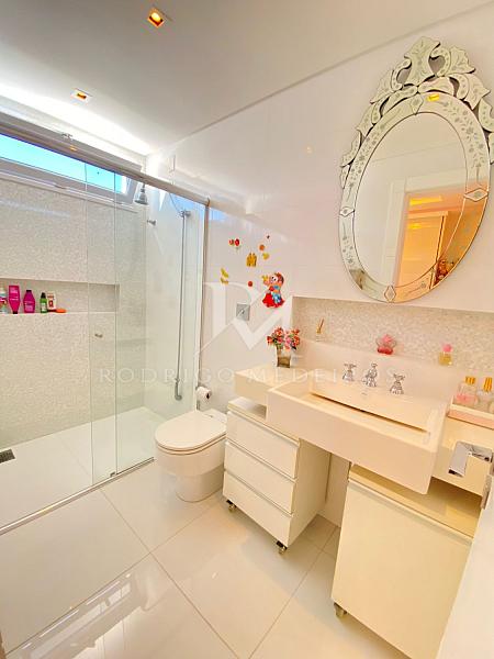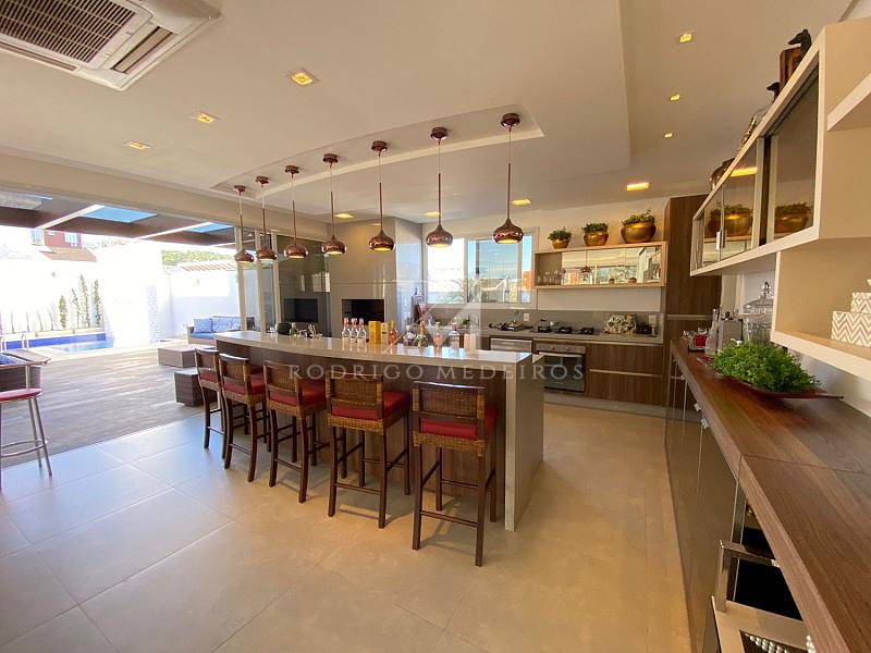 Com quatro suítes no pavimento superior, incluindo uma suíte master com closet e banheira de hidromassagem panorâmica, a residência ainda conta com pub no subsolo, brinquedoteca, academia, home office e piscina aquecida com sistema a gás.