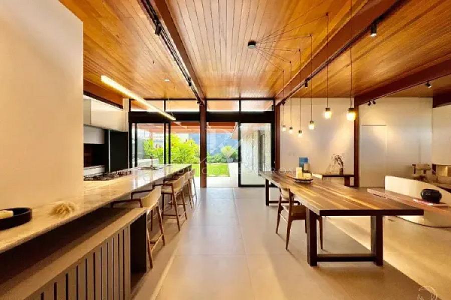 São 228 m² de área construída em um terreno de 365 m², com espaços amplos, bem iluminados e cuidadosamente planejados. A residência possui três dormitórios, sendo duas suítes — uma delas com closet e banheira. A área social se destaca pelo conceito aberto, integrando sala e cozinha com elegância e praticidade.