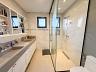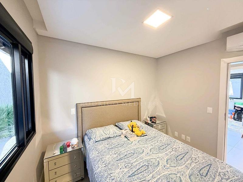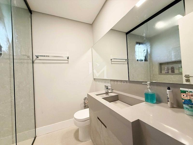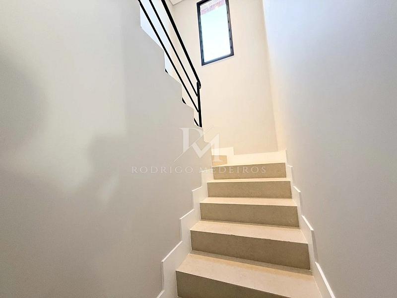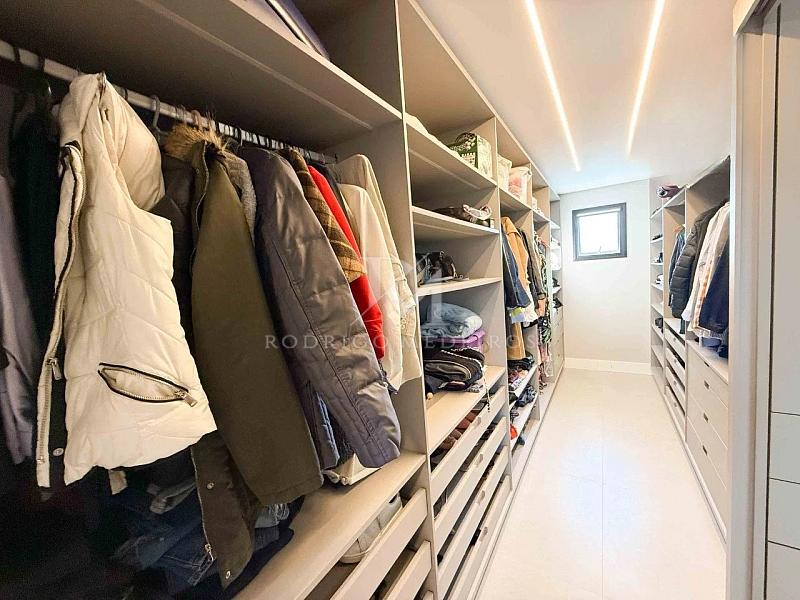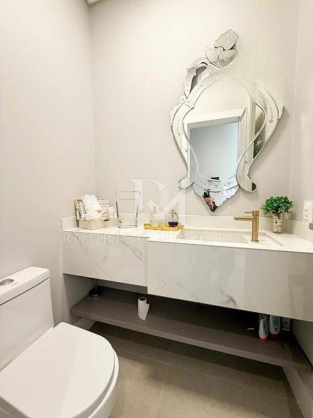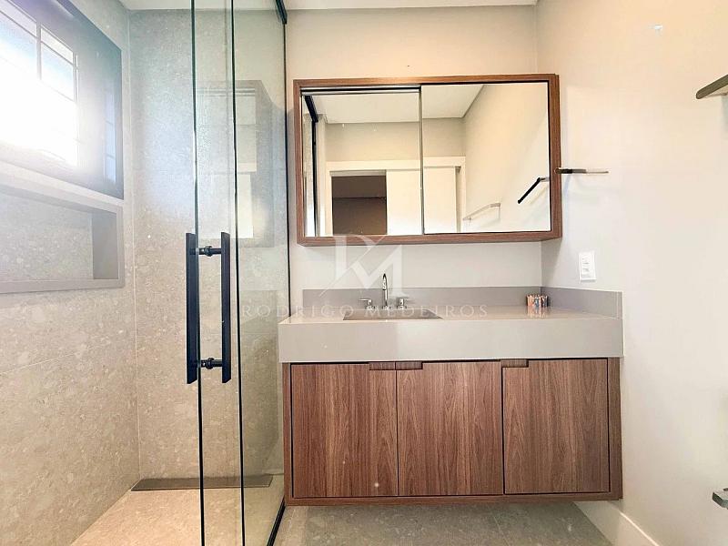 No pavimento superior, a área íntima principal se destaca pela suíte do casal, que conta com closet amplo, cuba dupla e excelente dimensão. Ainda neste andar, um escritório completo com sacada oferece um espaço reservado e bem iluminado, ideal para home office ou estudos.