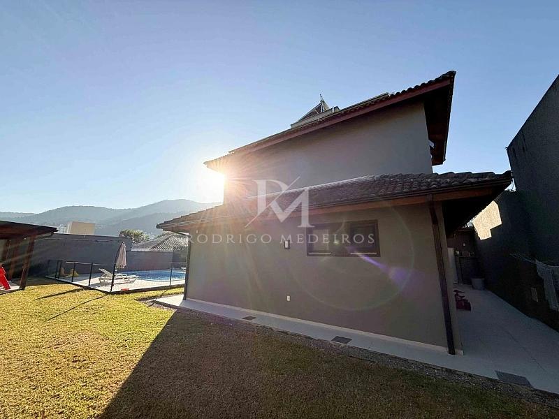 A área externa complementa o projeto com um jardim agradável, banheiro auxiliar e depósito, além de duas vagas de garagem cobertas, garantindo praticidade no dia a dia. A casa conta ainda com sistema de aquecimento e energia solar, agregando eficiência energética e conforto térmico à residência.