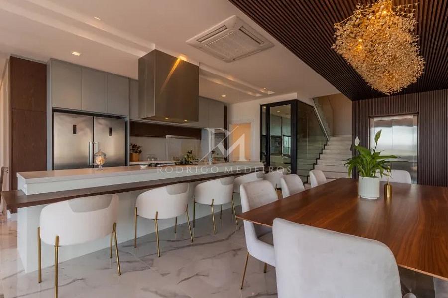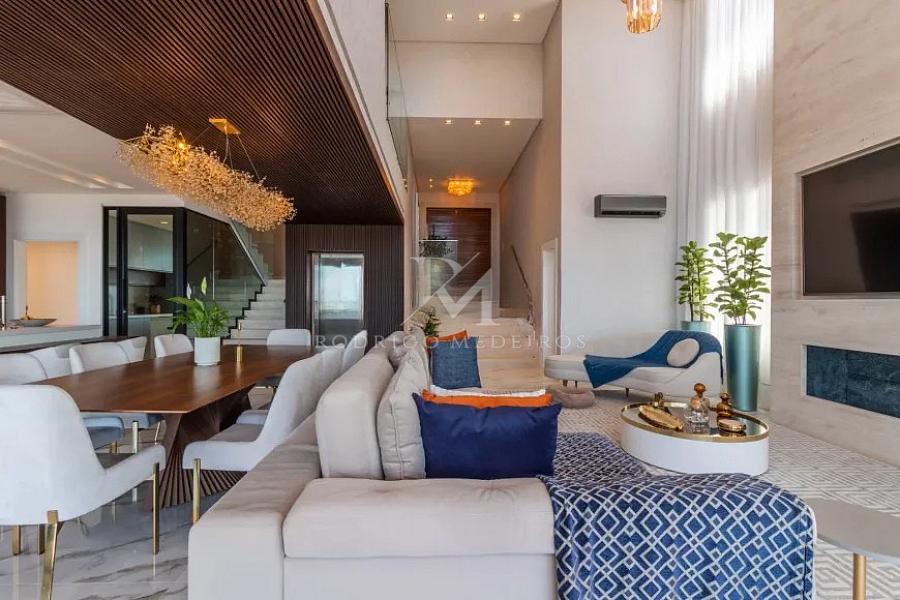 O living principal impressiona pelo pé-direito duplo e pela integração fluida entre estar, jantar e cozinha, formando um espaço amplo e sofisticado, com mais de 200 m². As aberturas generosas em PVC ampliam a conexão com a área externa, enquanto a lareira complementa o ambiente com conforto e elegância. A cozinha equipada com eletrodomésticos Elettromec reforça o padrão elevado da residência.