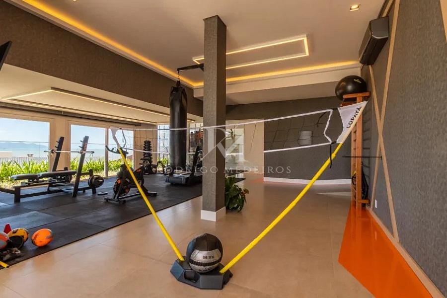 A residência também incorpora ambientes dedicados ao estilo de vida contemporâneo, como o espaço fitness com aproximadamente 120 m², equipado com estrutura de alto nível, além de sauna, área para yoga e pilates — um verdadeiro refúgio de bem-estar dentro de casa.