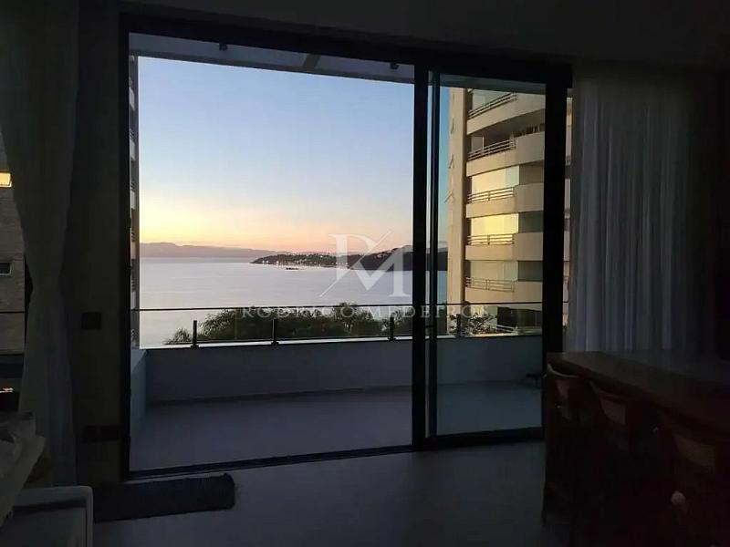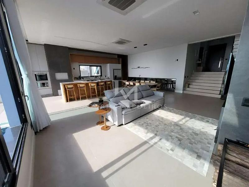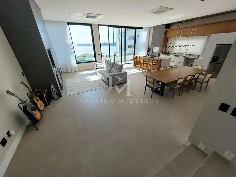 Com 405 m² de área total, a residência apresenta ambientes amplos e bem distribuídos. O living integra sala de estar, sala de TV e sala de jantar de forma fluida, criando uma atmosfera acolhedora e versátil. A sacada amplia a conexão com a paisagem, valorizando a vista para a baía e proporcionando luminosidade natural aos ambientes sociais.