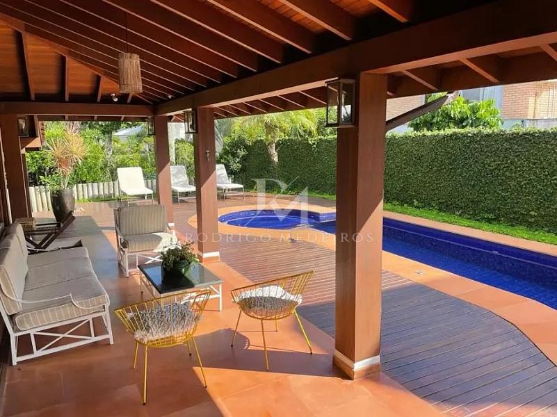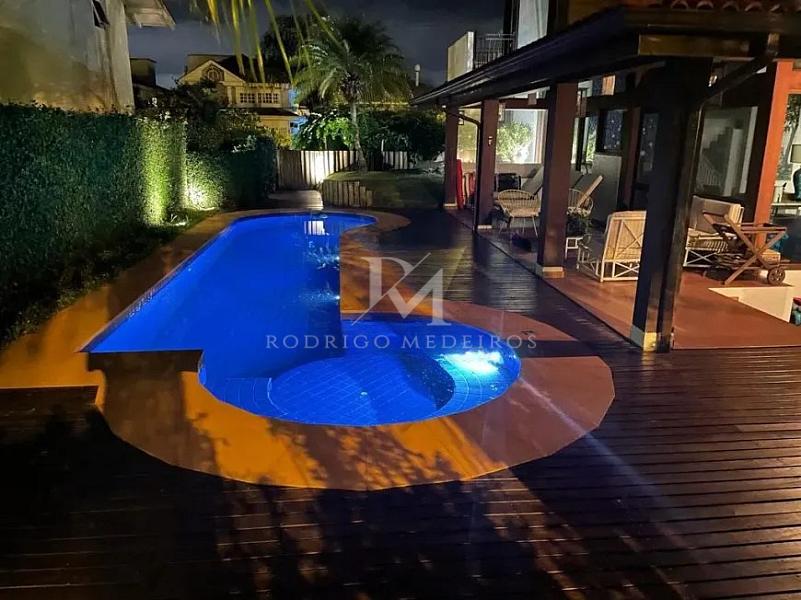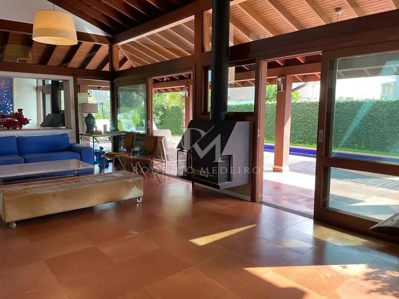 No térreo, a casa conta com uma suíte funcional, ideal para receber hóspedes, além de cozinha americana completa, sala de estar com lareira integrada à piscina e churrasqueira, lavabo, lavanderia, dependência de empregada e sala de TV. Todos os ambientes possuem ar-condicionado e revestimento em porcelanato, trazendo sofisticação e praticidade ao dia a dia.