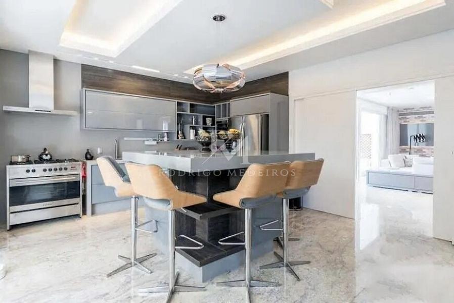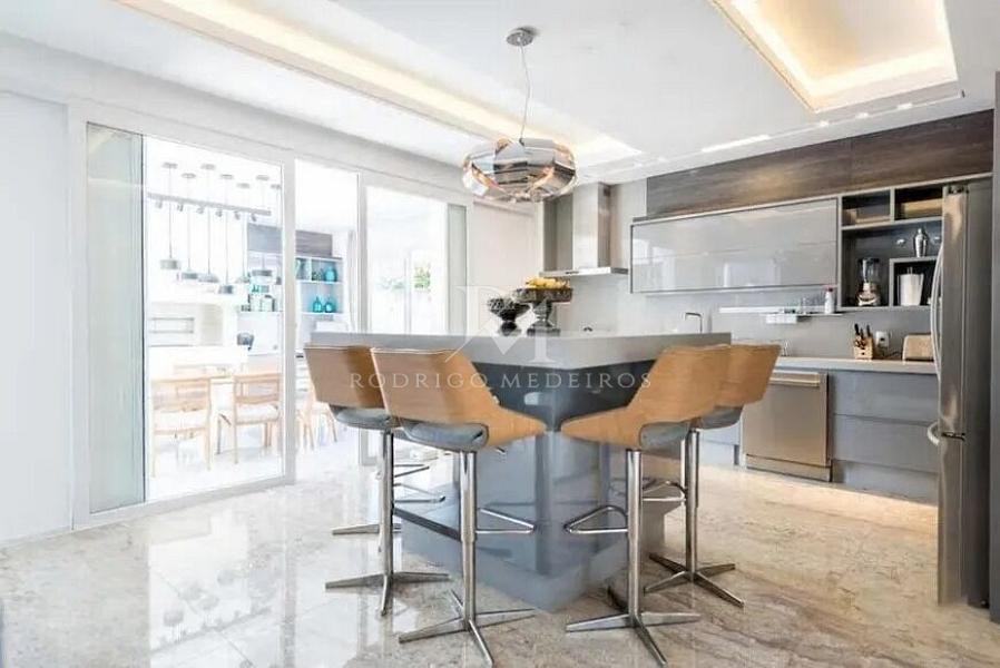 A cozinha gourmet é equipada com churrasqueira e totalmente integrada à área externa, onde a piscina em revestimento de pastilhas torna-se protagonista dos momentos de lazer. No subsolo, um espaço versátil permite diversas possibilidades de uso, como home theater, adega ou sala de jogos.