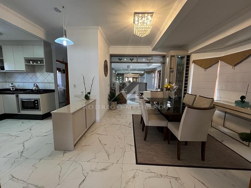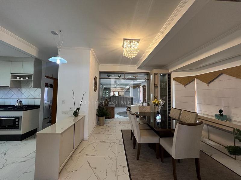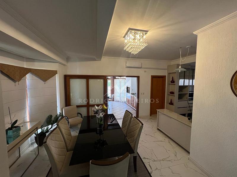 A residência possui 280 m² de área construída sobre um terreno de 450 m². São cinco suítes bem distribuídas, com marcenaria planejada e banheiros elegantes, além de áreas sociais amplas e iluminadas. O living integra sala de estar com lareira, sala de jantar, copa e cozinha espaçosa, em uma composição pensada para o convívio diário e encontros especiais.