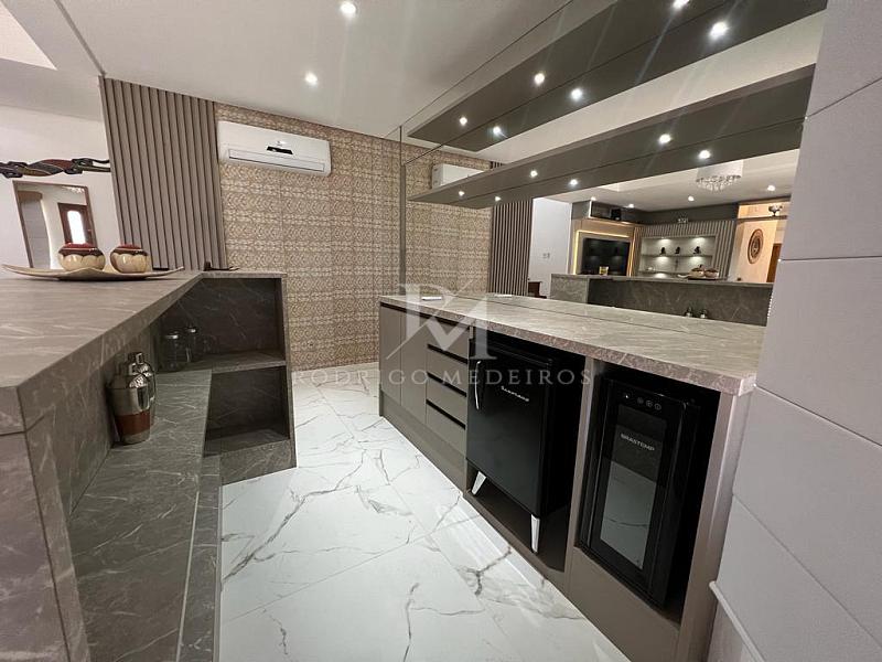 Na área externa, o espaço gourmet com churrasqueira convida a momentos de celebração ao lado da piscina, rodeada por paisagismo bem cuidado. O imóvel está completamente mobiliado, decorado e equipado — pronto para uso imediato.