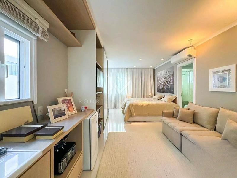 A área íntima conta com seis suítes, todas com closet, além de banheiras de hidromassagem em duas delas e sacadas com vista para o mar. Os dormitórios possuem excelente espaço interno e climatização, com sistema de ar-condicionado central e unidades split distribuídas pela casa.
