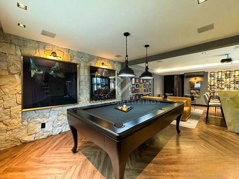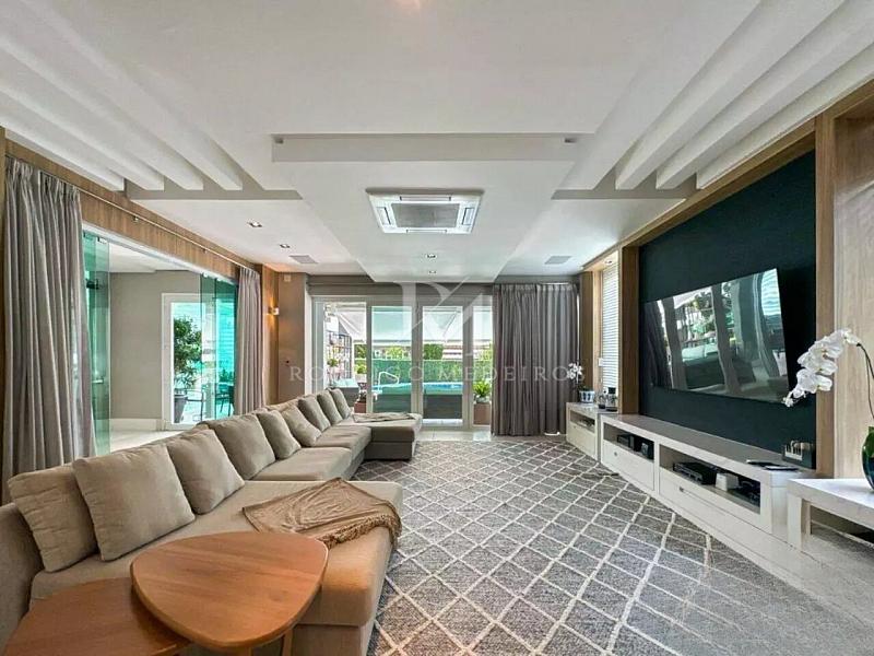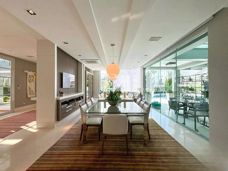 A área social conta com salas de estar e jantar espaçosas, sala de jogos, home office, academia equipada, copa, cozinha, despensa e espaço gourmet com churrasqueira, ideal para momentos de convivência. A residência possui ainda lareira, sauna e diversos ambientes de apoio que garantem funcionalidade no dia a dia.