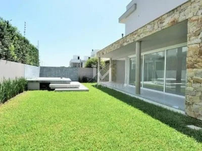 Com 390 m² de área útil distribuídos em dois pavimentos, a arquitetura contemporânea se impõe desde a fachada com linhas retas, paisagismo envolvente e um deck em madeira que emoldura o terreno amplo de 450 m². A porta pivotante em grande formato antecipa a sensação de amplitude, reforçada pelo pé-direito duplo do hall de entrada.