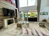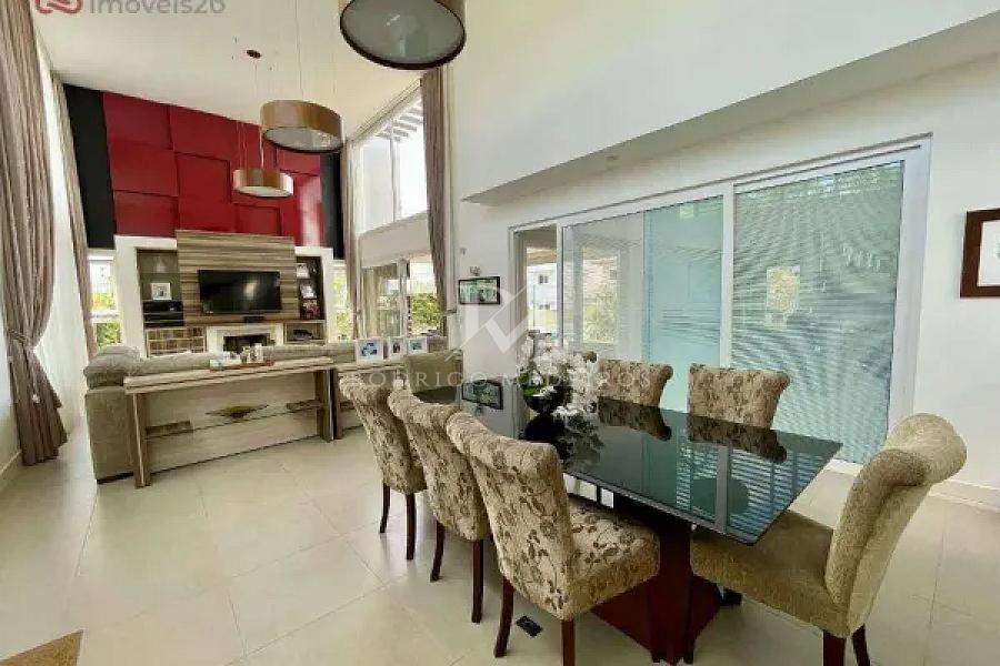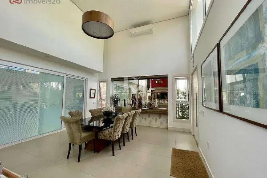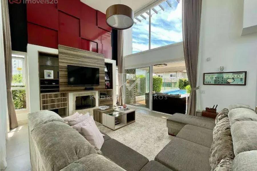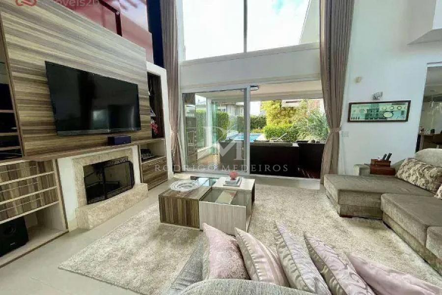 Com 569m² de área útil distribuídos em um terreno de 450m², o projeto prioriza a amplitude e o aproveitamento da iluminação natural. A área social conta com sala para dois ambientes com lareira e pé-direito duplo — um espaço que impressiona já na chegada. A cozinha, equipada com ilha central, é ideal para quem valoriza praticidade e estilo no cotidiano.
