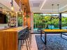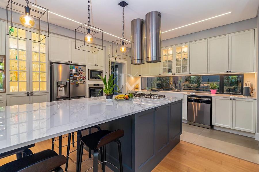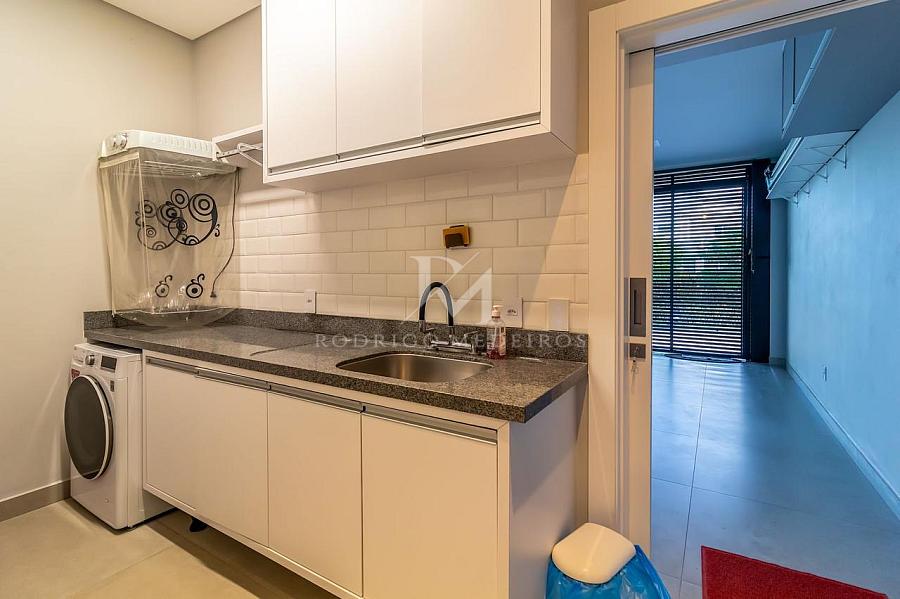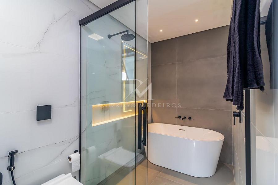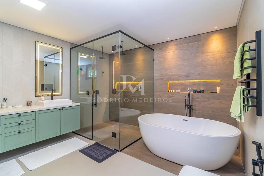 A residência também incorpora soluções modernas com sistema de energia solar, boiler com capacidade de 1500 litros, automação smart via Sonoff e infraestrutura de alto nível com móveis planejados Florense e bancadas em pedra Decton.