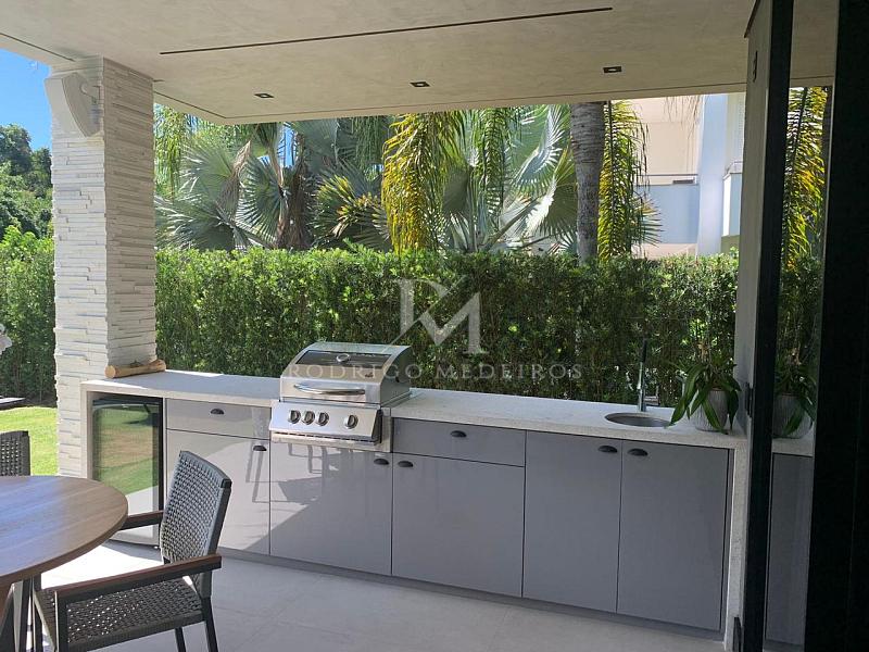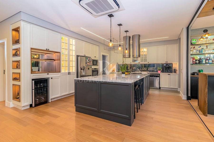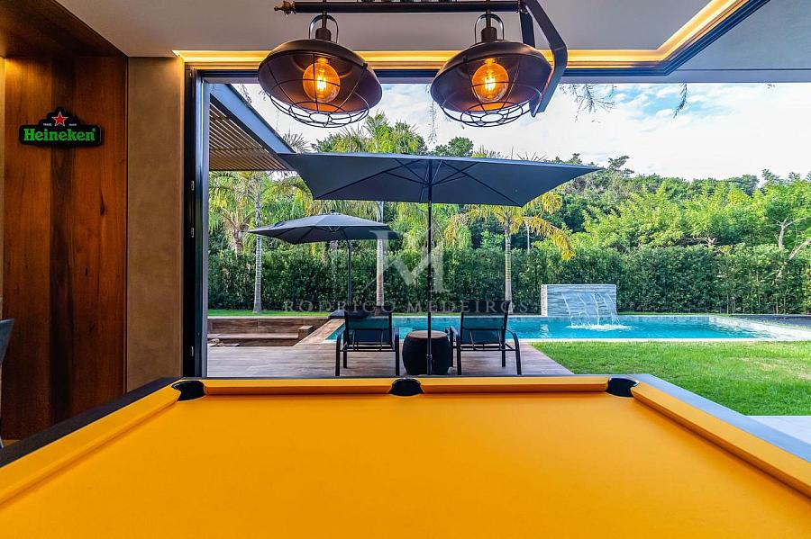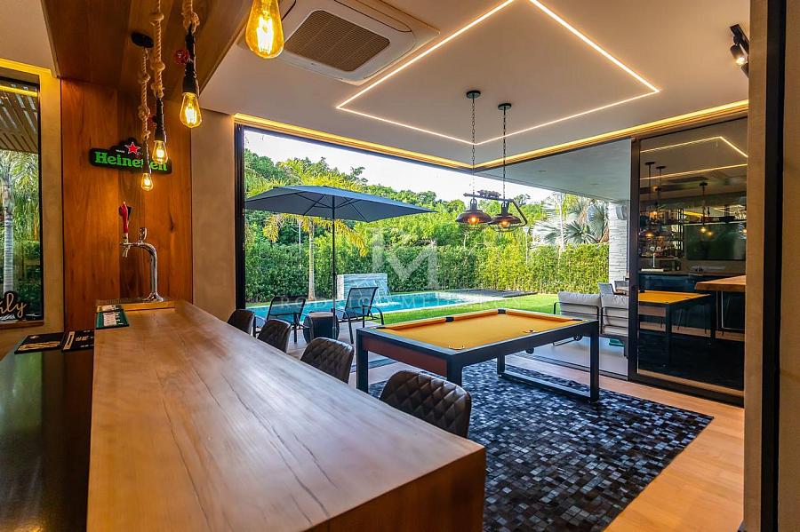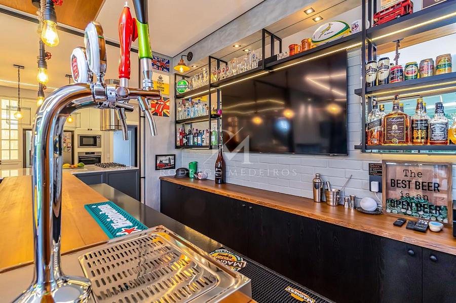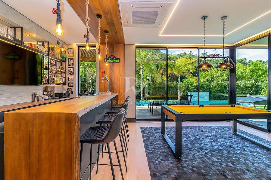 A área externa é um verdadeiro refúgio particular, com piscina aquecida, cascata, praça de fogo, cama elástica e um pub no estilo inglês que transforma qualquer encontro em uma experiência memorável. O espaço gourmet é completo, com churrasqueiras a gás e a carvão, forno e cooktop da prestigiada marca Gorenje, integrando funcionalidade e alto padrão de acabamento.