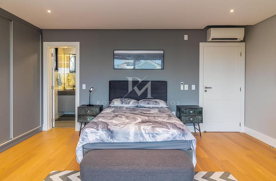 Com apenas 2 anos e meio de uso, a propriedade conta com quatro amplas suítes, totalizando cinco banheiros e três banhos com banheira, além de uma sala de cinema e uma lareira a gás que proporcionam aconchego e momentos únicos em família ou entre amigos.