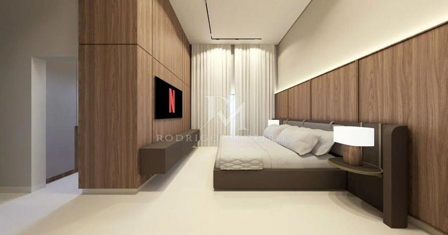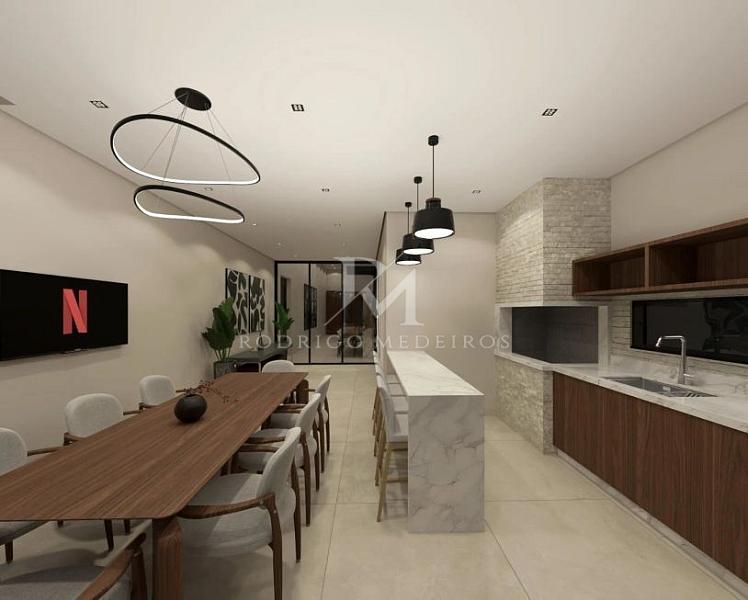 A área externa contempla piscina privativa e espaço gourmet integrado, criando um cenário perfeito para momentos de lazer e relaxamento. A residência contará ainda com sistema de energia fotovoltaica e infraestrutura para carregamento de carro elétrico, agregando eficiência e sustentabilidade ao projeto.