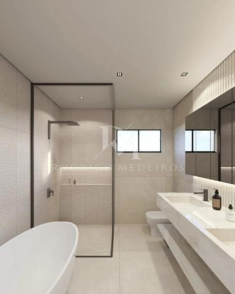 Na área íntima, são três suítes, sendo duas amplas e uma suíte master com closet e banheira, oferecendo conforto e privacidade. O desenho da planta favorece ventilação cruzada e iluminação natural, valorizando cada ambiente.
