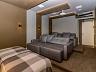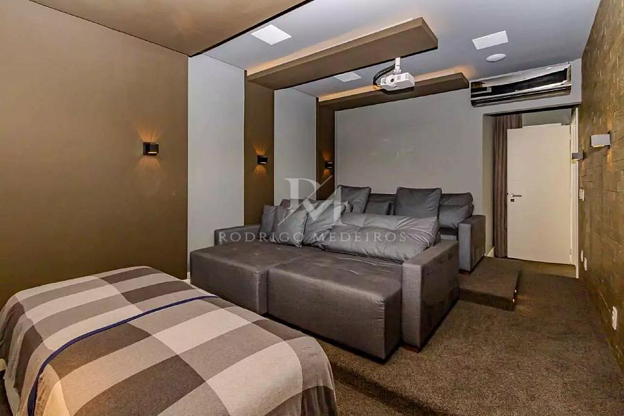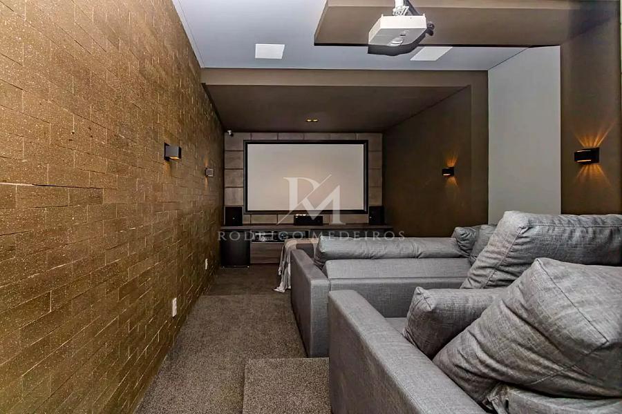 Um dos grandes diferenciais do imóvel é o cinema privativo — um ambiente cuidadosamente planejado, com sofás elétricos, projetor, sistema de som de alta qualidade, frigobar e climatização. Um espaço que transforma o entretenimento em uma experiência imersiva dentro de casa.