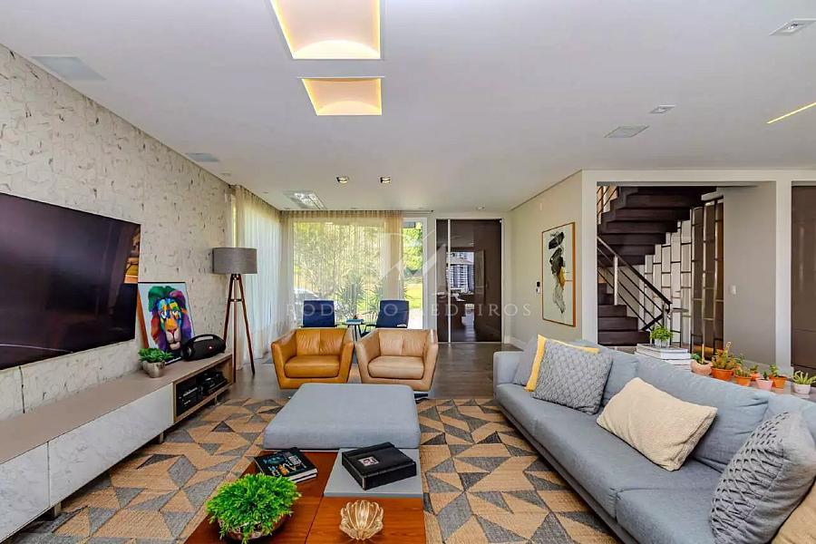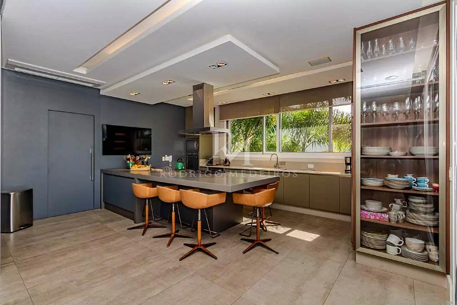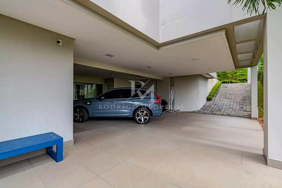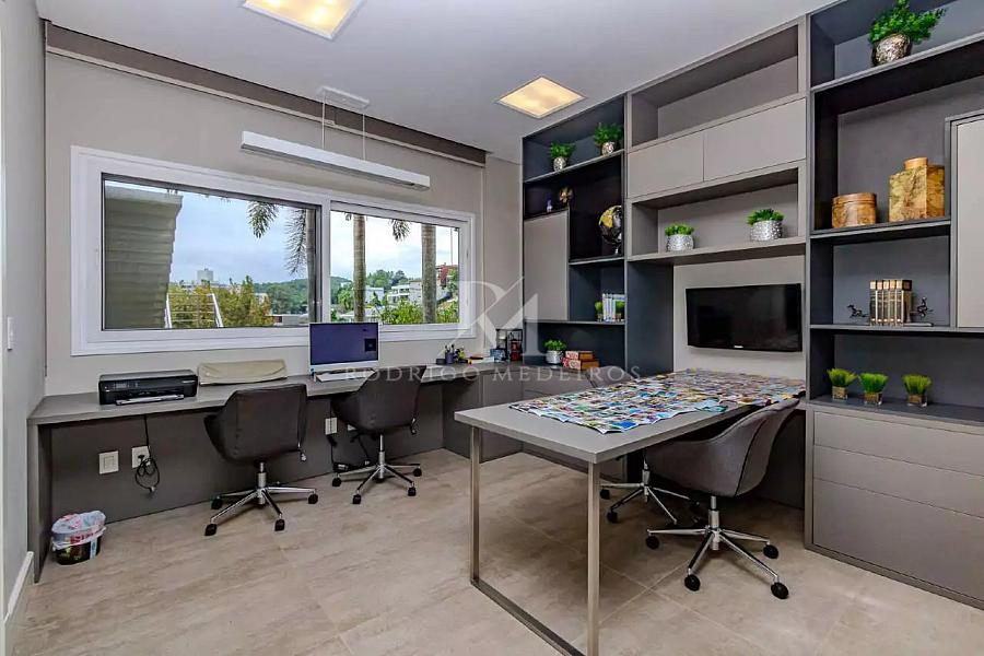 A residência ainda conta com escritório mobiliado, ideal para quem precisa de um espaço funcional para trabalho ou estudo, além de cinco vagas de garagem com ponto para carro elétrico — um diferencial alinhado às demandas contemporâneas.