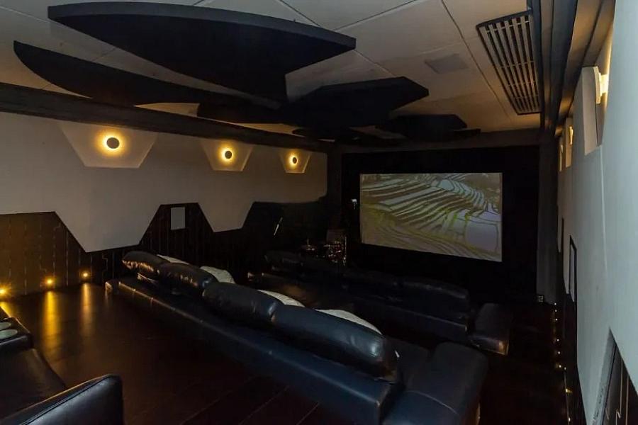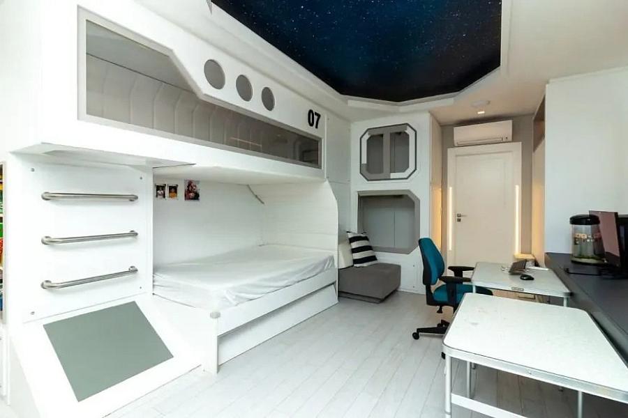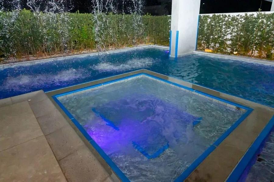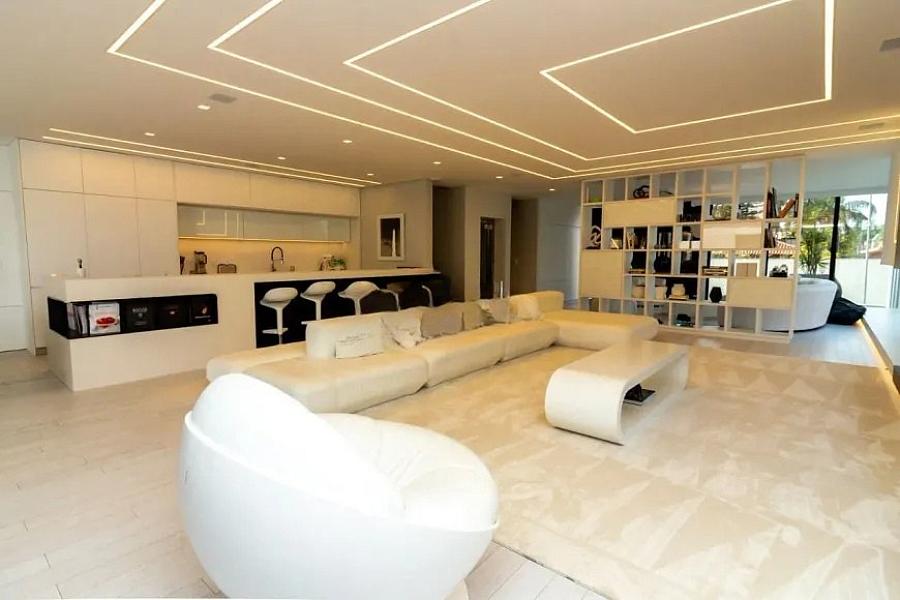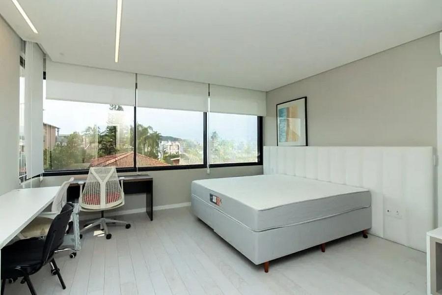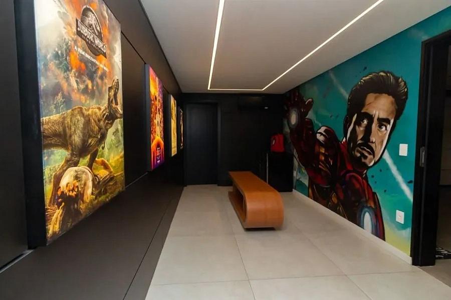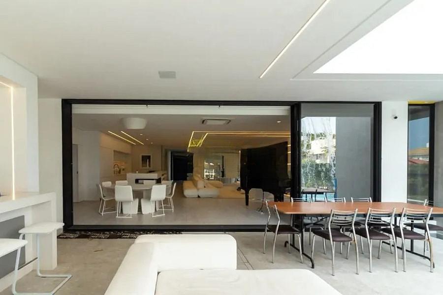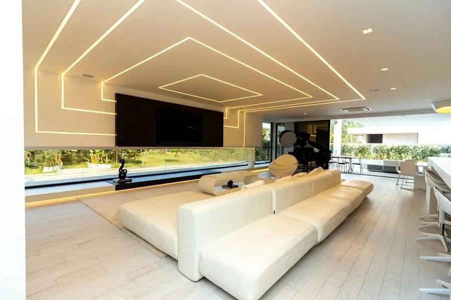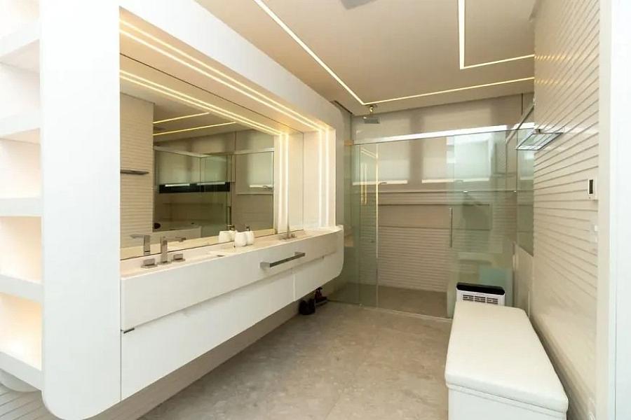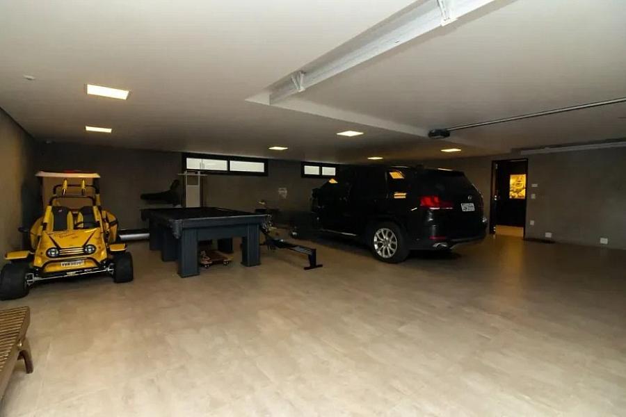 O interior foi projetado para impressionar em cada detalhe. São sete dormitórios — cinco deles suítes, todas com closet e hidromassagem — distribuídos em uma planta generosa que favorece o convívio familiar sem abrir mão da individualidade. O pé-direito duplo e as amplas aberturas garantem luminosidade natural e sensação de amplitude, enquanto o projeto luminotécnico valoriza a estética dos ambientes à noite.