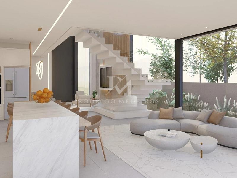 No aspecto técnico, a casa foi construída com materiais de alto padrão e soluções modernas. Possui sistema de aquecimento a gás com infraestrutura preparada para futura instalação de apoio solar, tomada para carro elétrico, espera para ar-condicionado split em todos os ambientes, esquadrias em PVC com persianas elétricas e acabamento em porcelanato Portobello. Os detalhes internos incluem escada revestida em quartzo, portas brancas com ferragens em preto fosco, piso vinílico nos quartos, banheira na suíte master, rebaixo em gesso e iluminação 100% em LED.