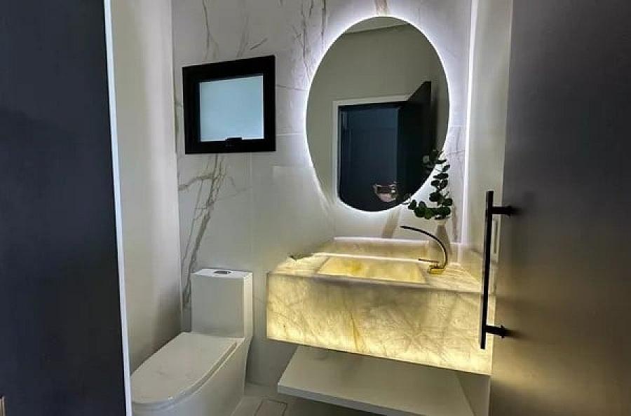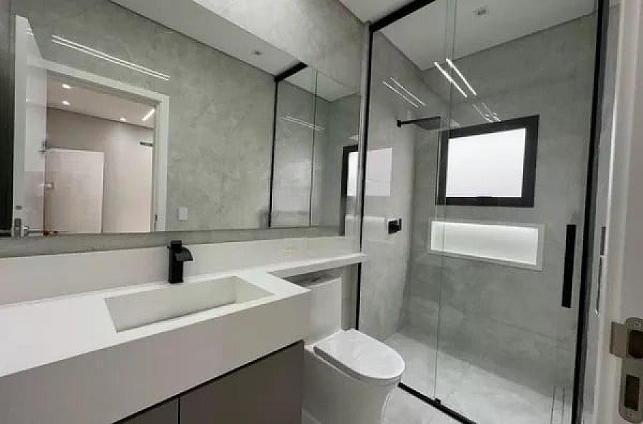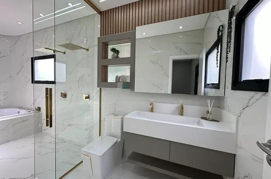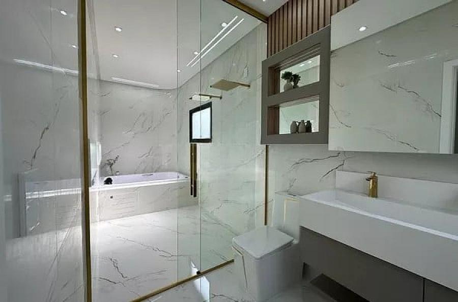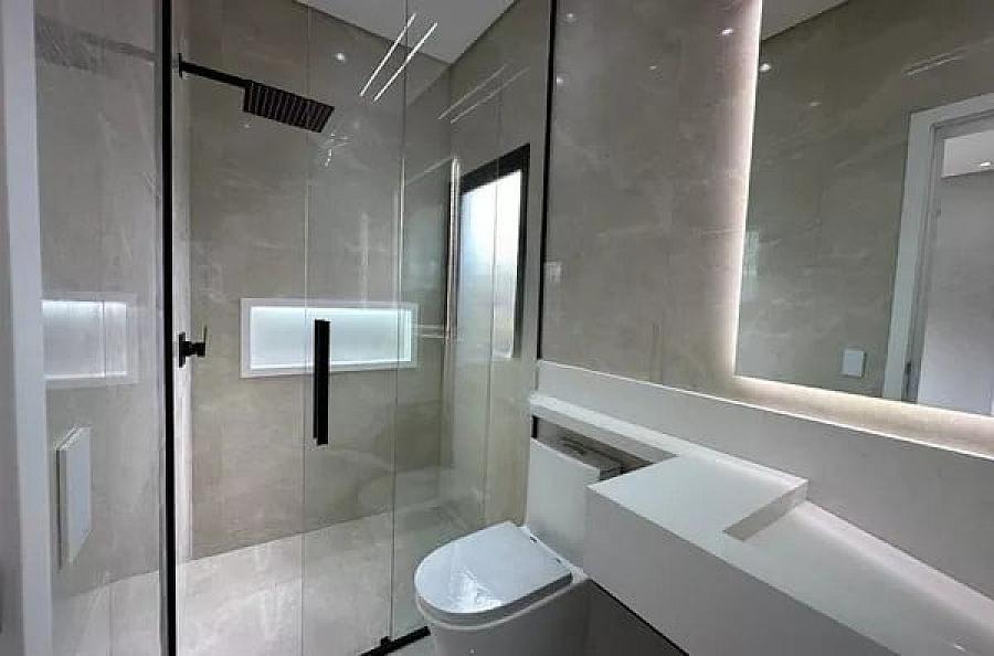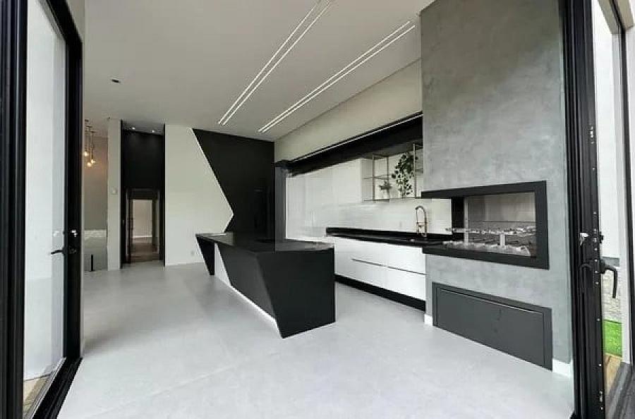 São três suítes, incluindo uma suíte master com amplo closet e banheira, em uma planta que valoriza integração e funcionalidade. A área social conecta sala, cozinha e espaço gourmet à piscina com borda infinita e lavabo externo — um verdadeiro refúgio privado com estética impecável.