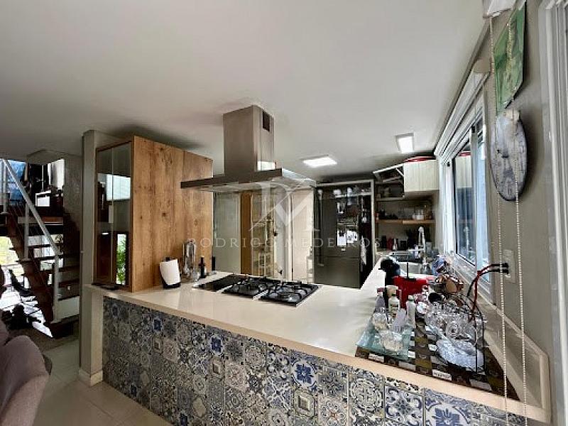 A cozinha gourmet impressiona com bancadas em mármore branco especial e móveis planejados que unem estética e funcionalidade. O mezanino com sala íntima oferece um espaço aconchegante para momentos em família.