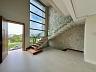 Com 335 m² de área privativa em um terreno de 360 m², o projeto foi cuidadosamente desenvolvido para oferecer amplitude e fluidez entre os ambientes. Logo na entrada, o pé-direito duplo no hall imprime imponência e valoriza a iluminação natural, criando uma recepção marcante.